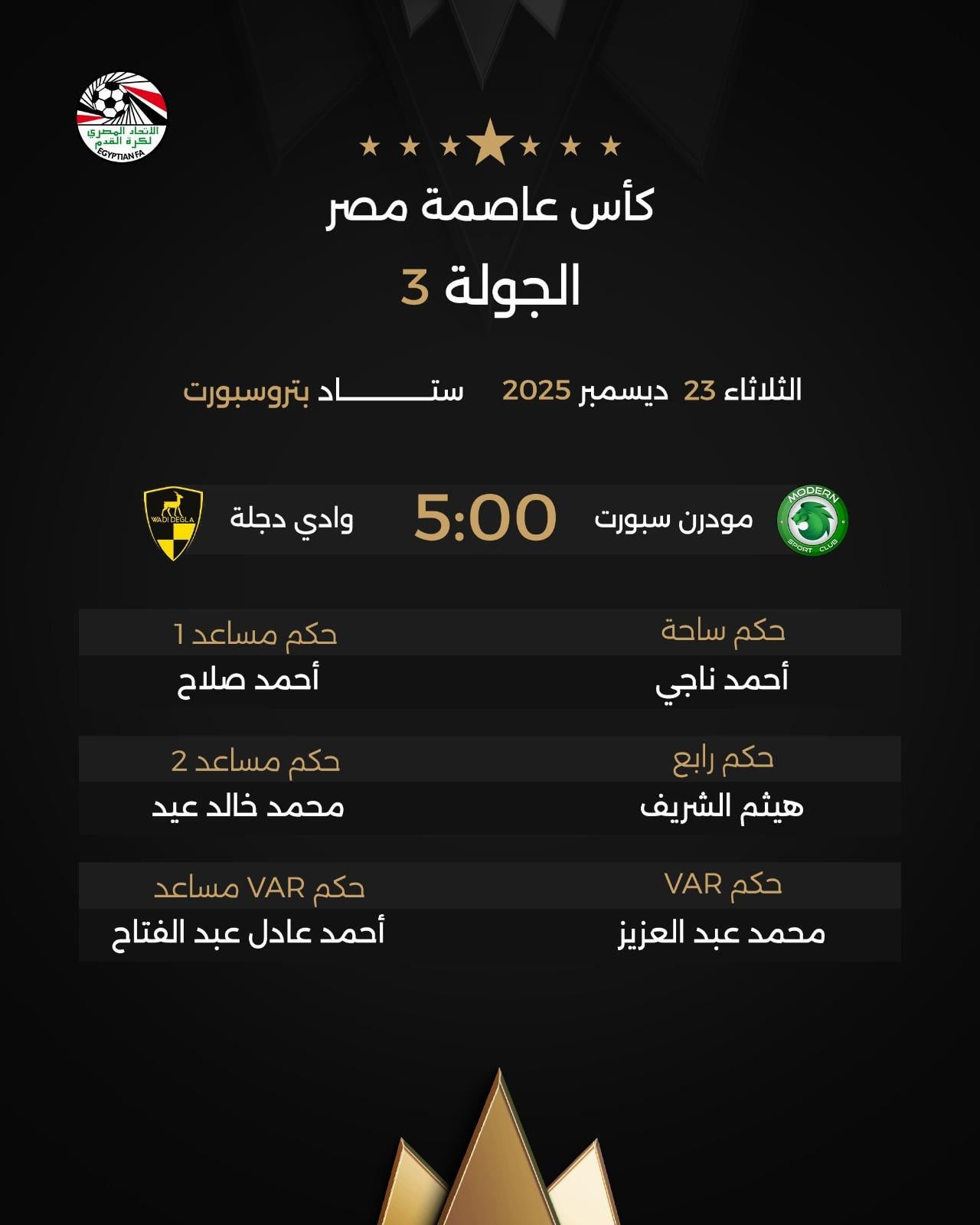 أما مباراة وادي دجلة ومودرن سبورت فيقودها طاقم تحكيم.....