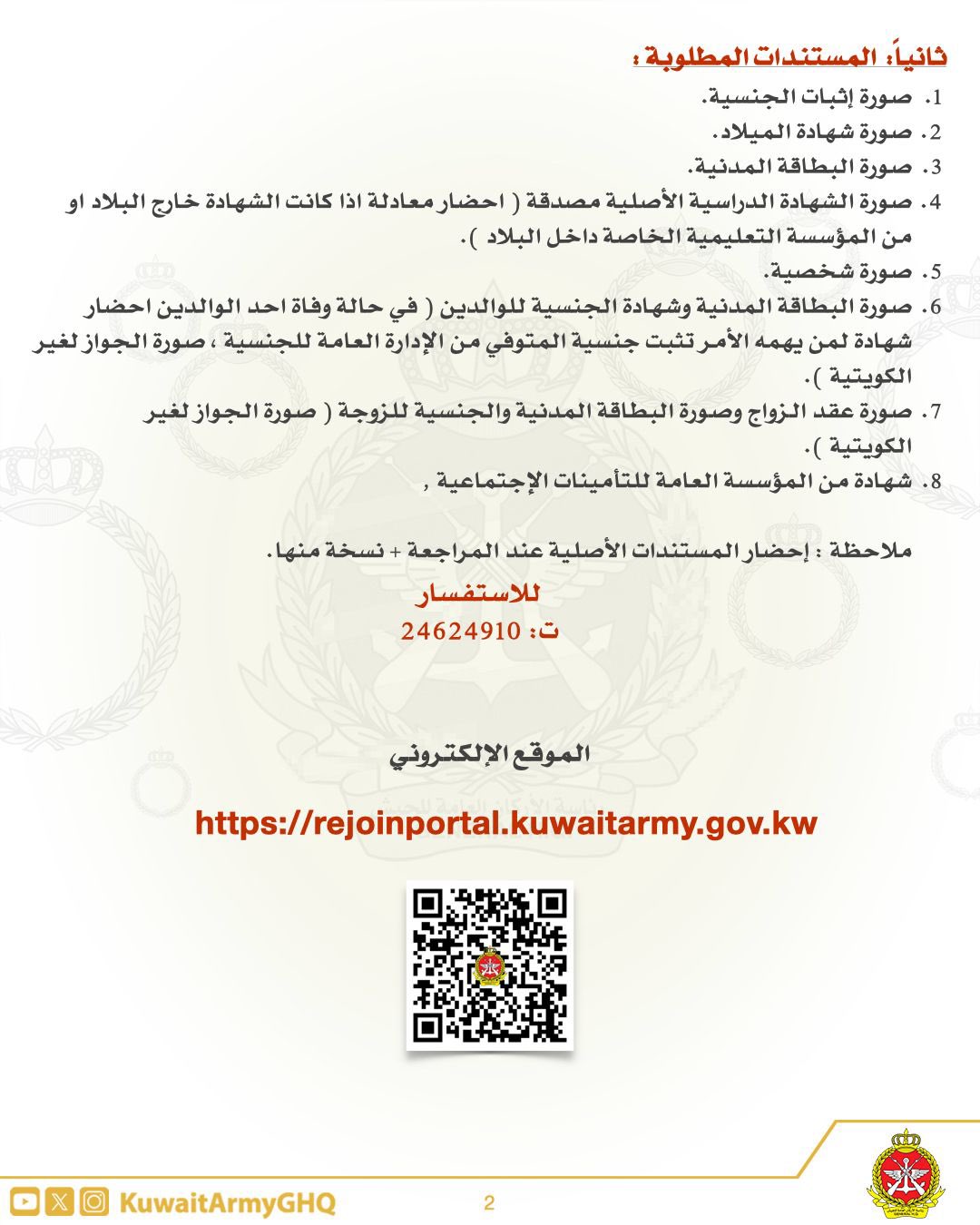 أعلنت رئاسة الأركان العامة للجيش (هيئة الإدارة والقوى البشرية) عن فتح باب التطوع لإعادة الخدمة العسكرية لمنتسبي الجيش الكويتي فقط، وذلك اعتبارًا من اليوم الاثنين الموافق 22 ديسمبر 2025.