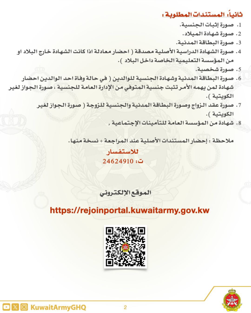 أعلنت رئاسة الأركان العامة للجيش (هيئة الإدارة والقوى البشرية) عن فتح باب التطوع (لإعادة خدمة العسكرية) لمنتسبي الجيش الكويتي فقط، اعتباراً من اليوم الموافق 2025/12/22.