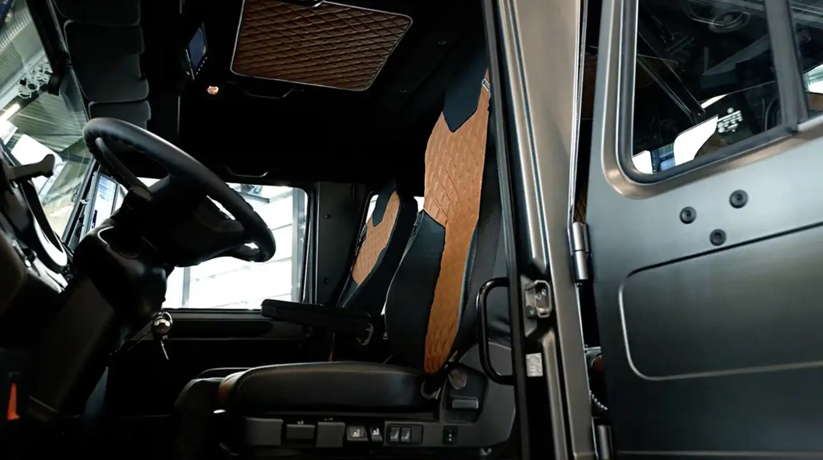 في الداخل، يتغير المشهد كلياً. مقاعد مريحة بتصميم هندسي مدروس، مكسوّة بجلد فاخر مع خياطة متباينة، إضاءة محيطية تضيف دفئاً غير معتاد على هذا الاسم. لن نصل إلى عالم سيارات Maybach، ولا هذا هو الهدف أصلًا. لكن مقارنة بأي Unimog عرفناه سابقاً؟ الفارق واضح، ومقصود، ومدروس.