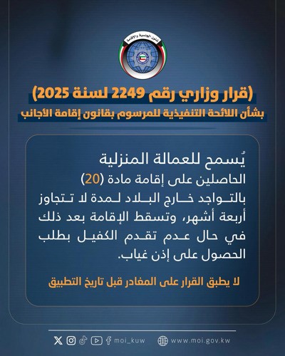 وأكدت الوزارة أن تطبيق اللائحة يأتي ضمن خططها المستمرة لتحديث الأنظمة والإجراءات، وبما يحقق المصلحة العامة ويضمن الالتزام بالقوانين واللوائح المنظمة لشؤون إقامة الأجانب في البلاد.