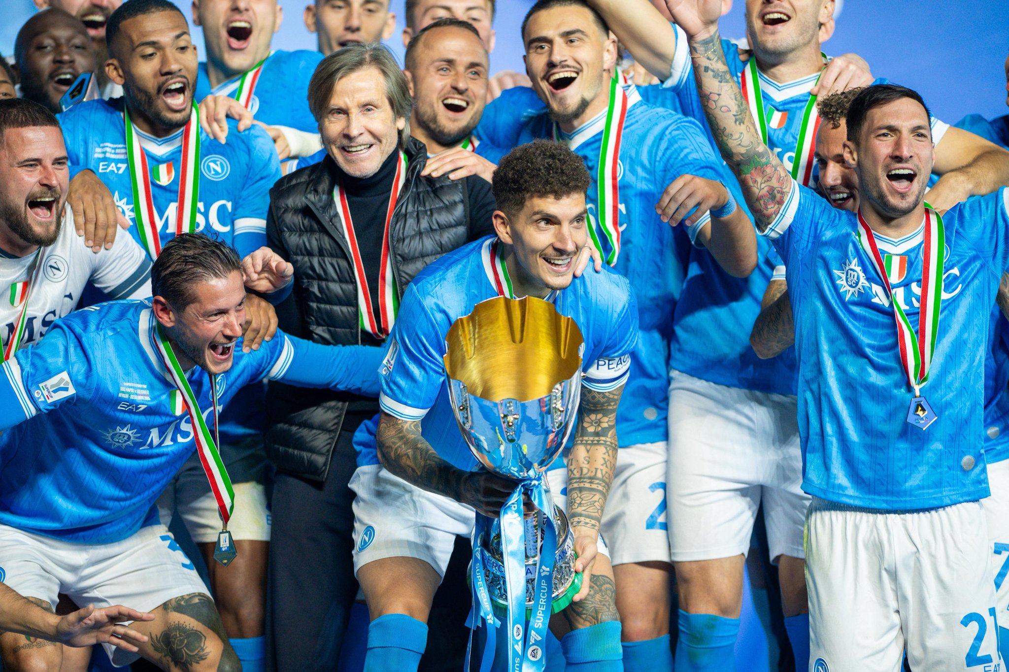 احتفالات لاعبي نابولي بعد نهاية المباراة وتحقيقهم بطولة السوبر الإيطالي. أمل السعيد