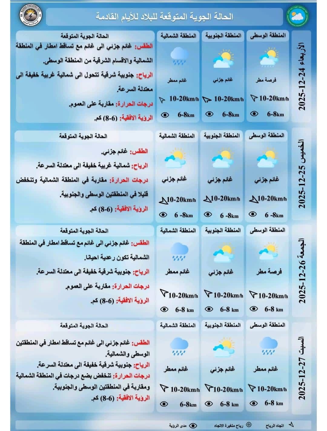 امطار رعدية وحرارة تصل الى 2 مئوية.. توقعات الطقس خلال أيام أعياد الميلاد