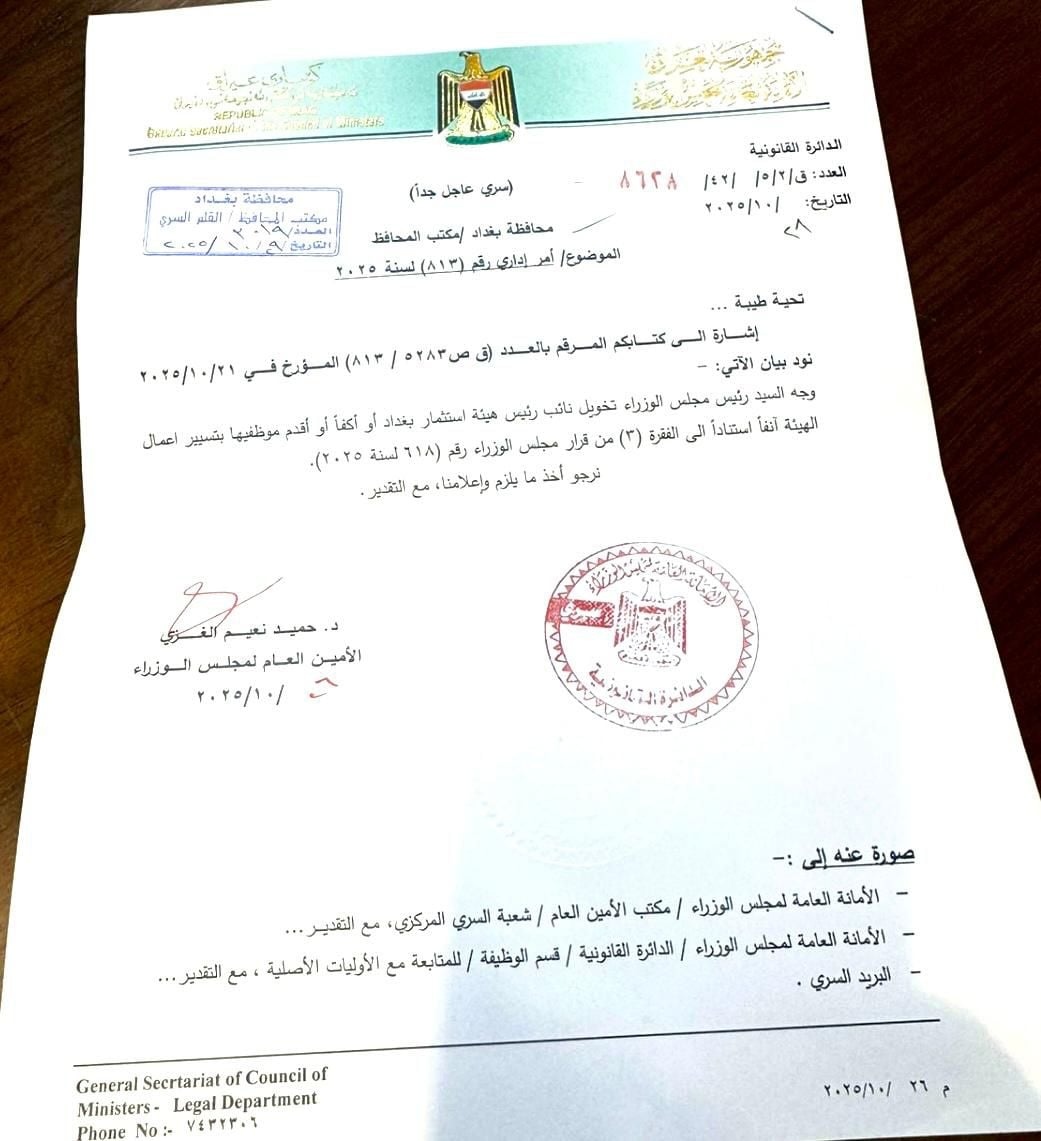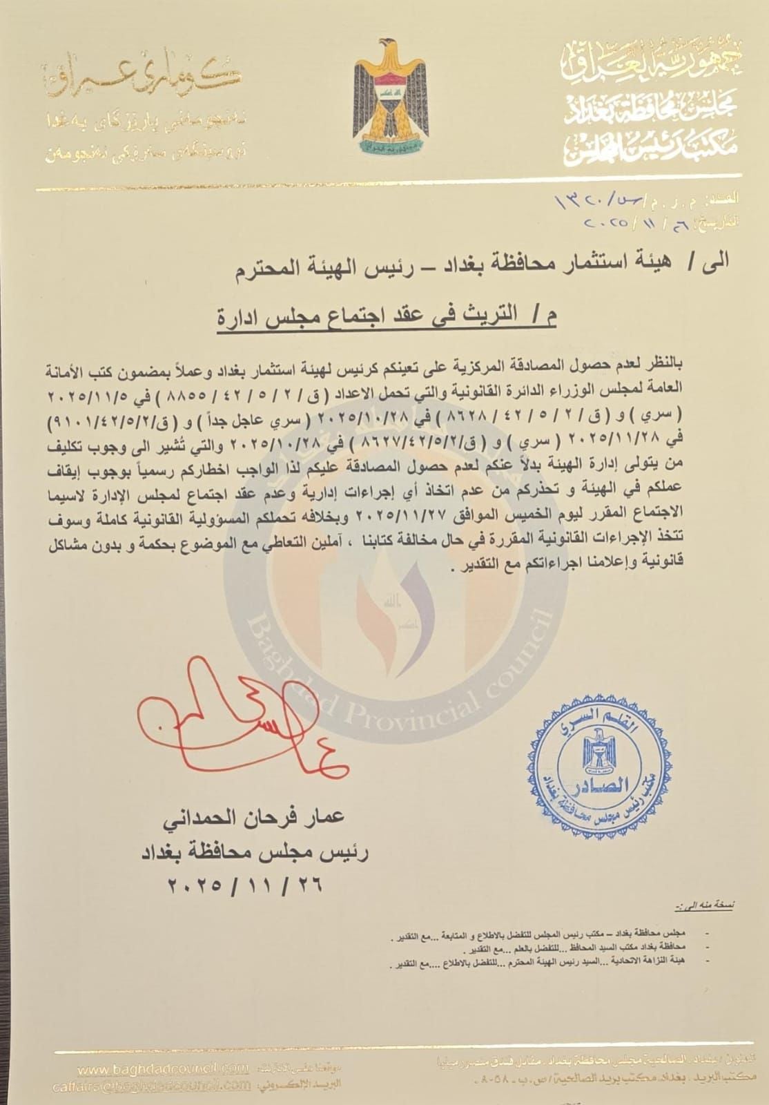 رغم الجدل القانوني الواسع الذي يحيط بشرعية تكليفه، يواصل رئيس هيئة استثمار بغداد ممارسة مهامه التنفيذية، متجاوزًا حدود الصلاحيات الممنوحة له، في خطوة أثارت تساؤلات جدية حول احترام الأطر القانونية والمؤسسية. السومرية رغم الجدل القانوني الواسع الذي يحيط بشرعية تكليفه، يواصل رئيس هيئة استثمار بغداد ممارسة مهامه التنفيذية، متجاوزًا حدود الصلاحيات الممنوحة له، في خطوة أثارت تساؤلات جدية حول احترام الأطر القانونية والمؤسسية. فقد أقدم على الدعوة لعقد اجتماع مجلس إدارة الهيئة، في تحدٍ صريح للتعليمات النافذة وآراء قانونية تؤكد عدم أحقية المكلّف باتخاذ قرارات مصيرية أو إدارة اجتماعات رسمية الا بعد استحصال موافقة مجلس الوزراء، ما يفتح الباب أمام أزمة إدارية جديدة، ويضع ملف الاستثمار في بغداد أمام اختبار حساس بين سلطة القانون ومحاولات فرض الأمر الواقع.