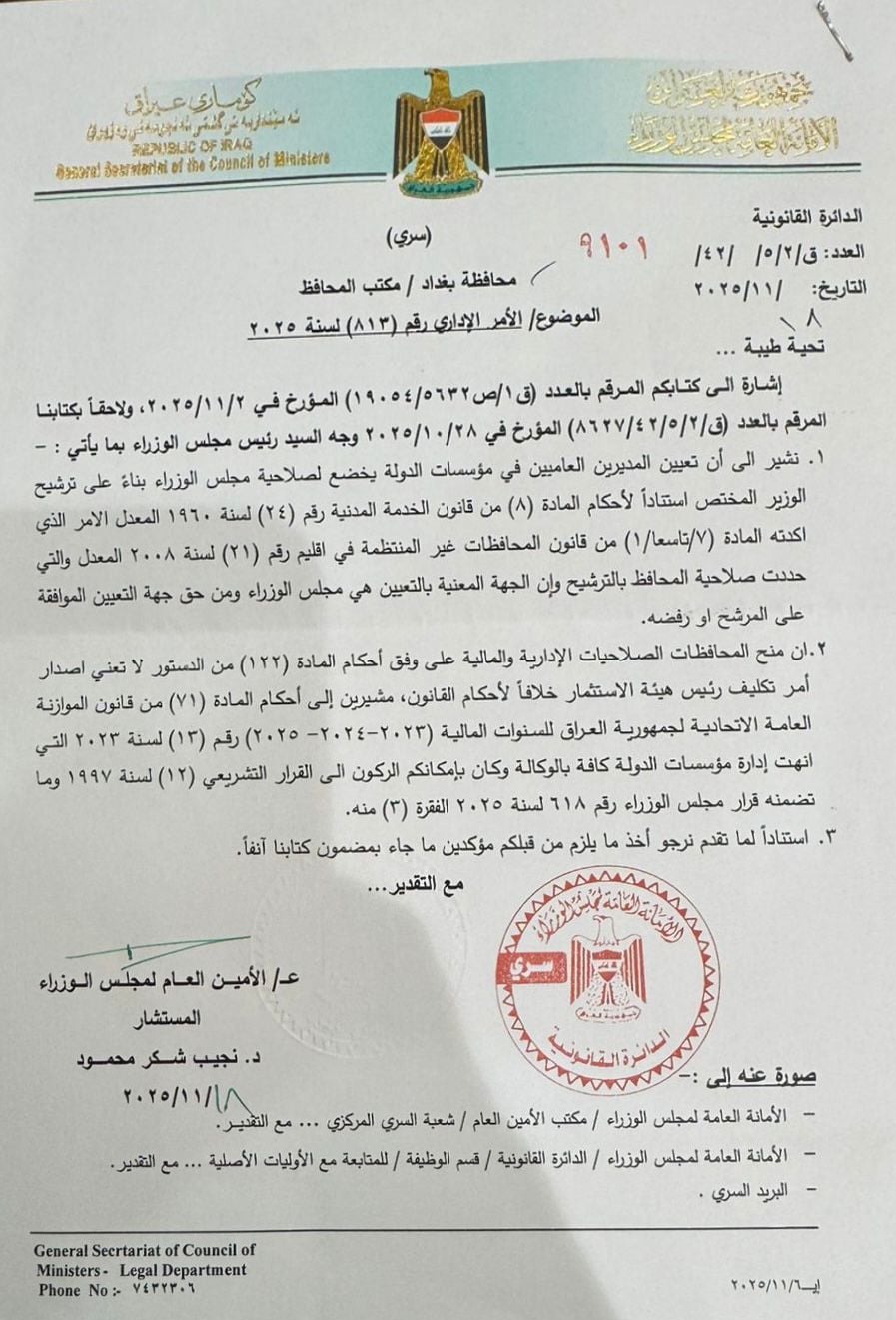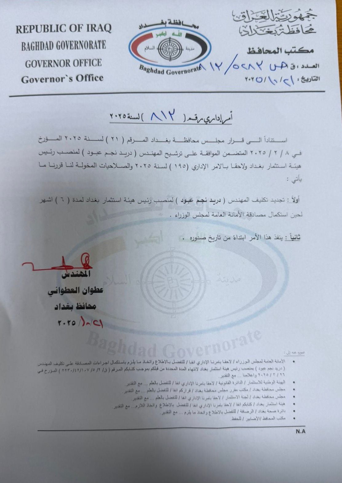 ويعود اصل التكليف بعدما اصدر محافظ بغداد عطوان العطواني في 21 تشرين الأول الماضي قرارا بتكليف دريد نجم عبود بمنصب رئيس هيئة استثمار بغداد لمدة 6 اشهار لحين استكمال مصادقة الأمانة العامة لمجلس الوزراء. الا ان قرار المحافظ اصطدم بالامر الإداري الذي أصدره الأمين العام لمجلس الوزراء في 26 تشرين الأول الماضي والذي تضمن توجيه رئيس الوزراء بتخويل نائب رئيس هيئة استثمار بغداد أو اكفأ أو أقدم موظفيها بتسيير اعمال الهيئة استنادا الى الفقرة 3 من قرار مجلس الوزراء رقم 618 لسنة 2025. كما ان الأمانة العامة لمجلس الوزراء اكدت ان موضوع تكليف مرشح لمنصب رئيس هيئة استثمار بغداد هو من صلاحية الحكومة عبر اصدار الامر الإداري للمحافظة بغداد في الـ18 من تشرين الثاني الماضي وتضمن ان "تعيين المديرين العامين في مؤسسات الدولة يخضع لصلاحية مجلس.....