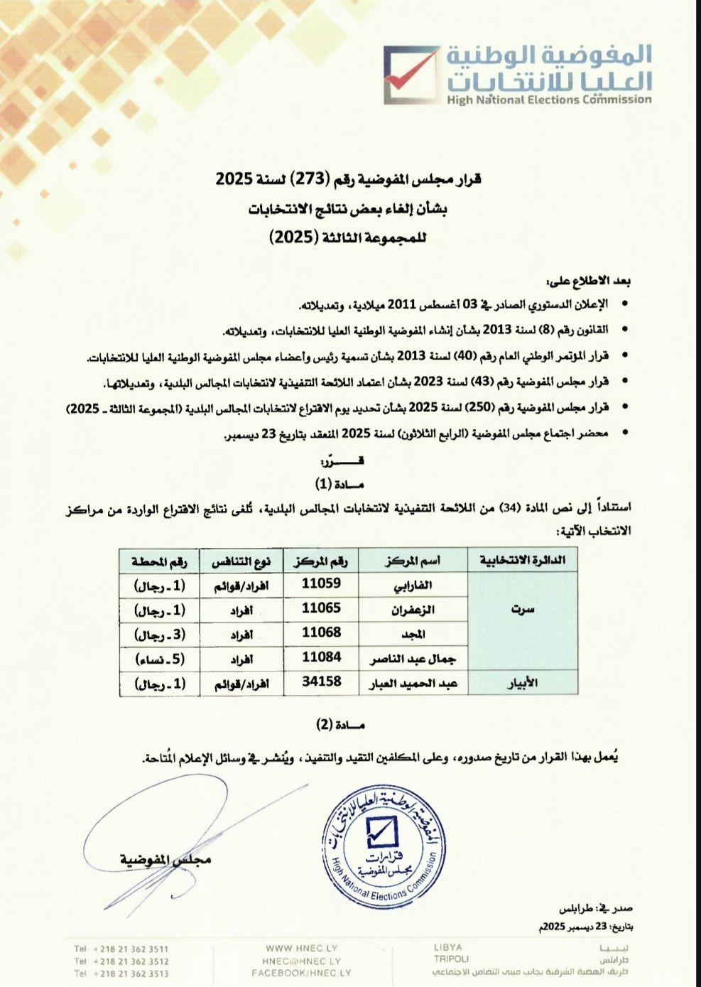 عاجل| المفوضية العليا تلغي نتائج انتخابات 5 مراكز اقتراع بسرت والأبيار بسبب خروقات بها. المفوضية العليا للانتخابات تعلن إلغاء نتائج انتخابات المجالس البلدية للمجموعة الثالثة 2025 في 5 مراكز اقتراع بسرت والأبيار بسبب خروقات بها.. المفوضية أصدرت القرار رقم (273) لسنة 2025، بشأن إلغاء بعض نتائج انتخابات المجالس البلدية للمجموعة الثالثة لسنة 2025، استنادًا إلى أحكام المادة (34) من اللائحة التنفيذية لانتخابات المجالس البلدية.. وجاء ذلك بعد ثبوت وجود خروقات ومخالفات بمحطات الاقتراع الواردة أسماؤها ضمن نص القرار.. المفوضية أكدت أن اتخاذ هذا الإجراء يندرج ضمن صلاحياتها القانونية، ويهدف إلى حماية إرادة الناخبين وضمان مبدأ الشفافية وتكافؤ الفرص بين المترشحين.. كما أشارت إلى أن بقية نتائج المحطات غير المشمولة بالقرار تظل