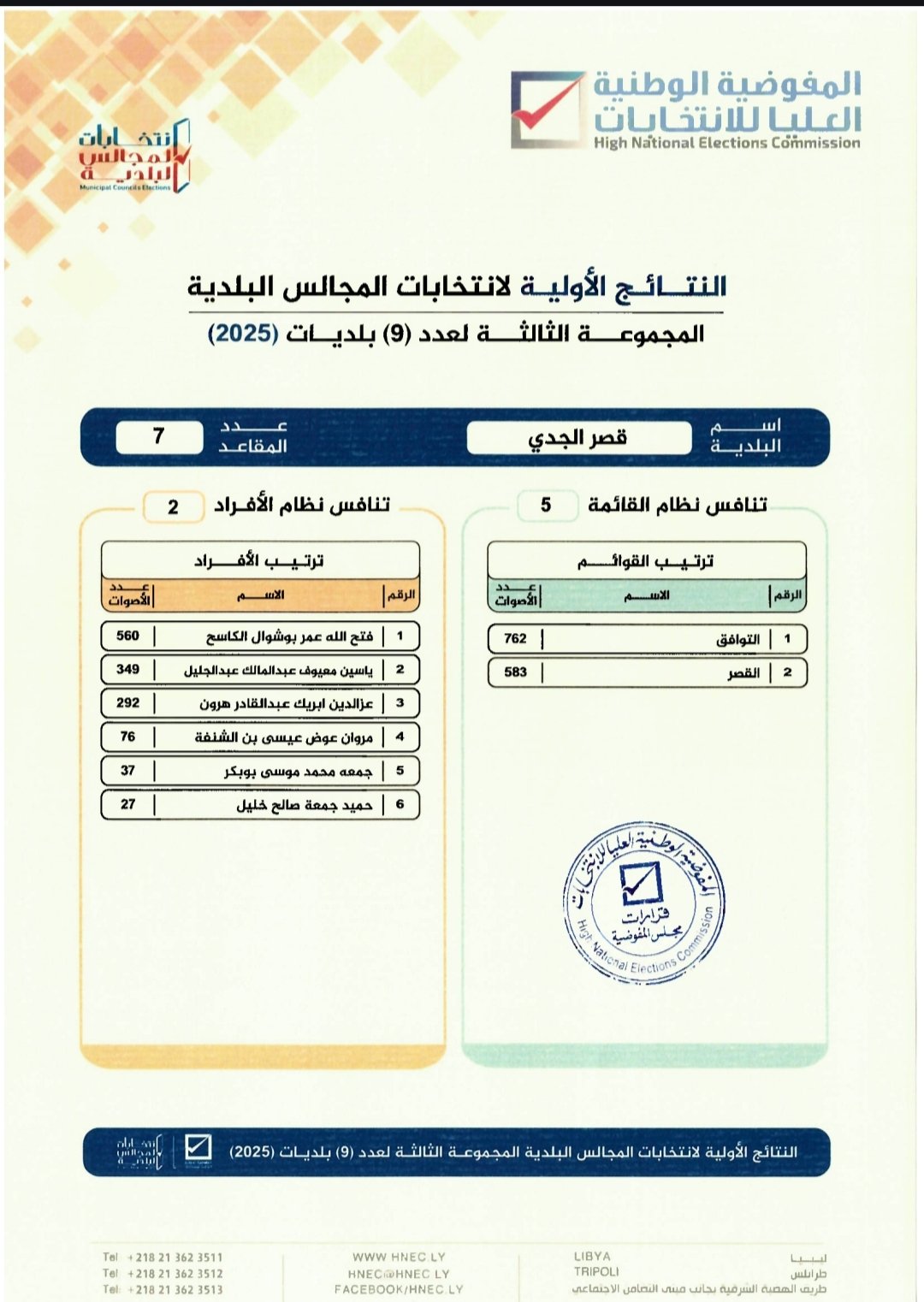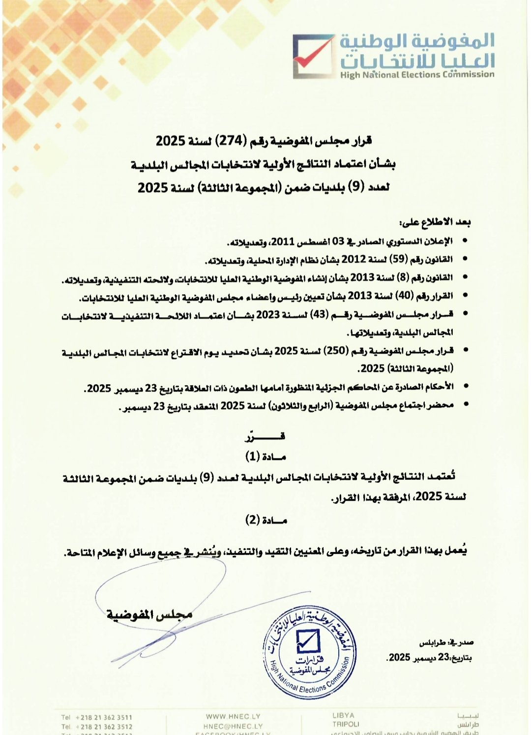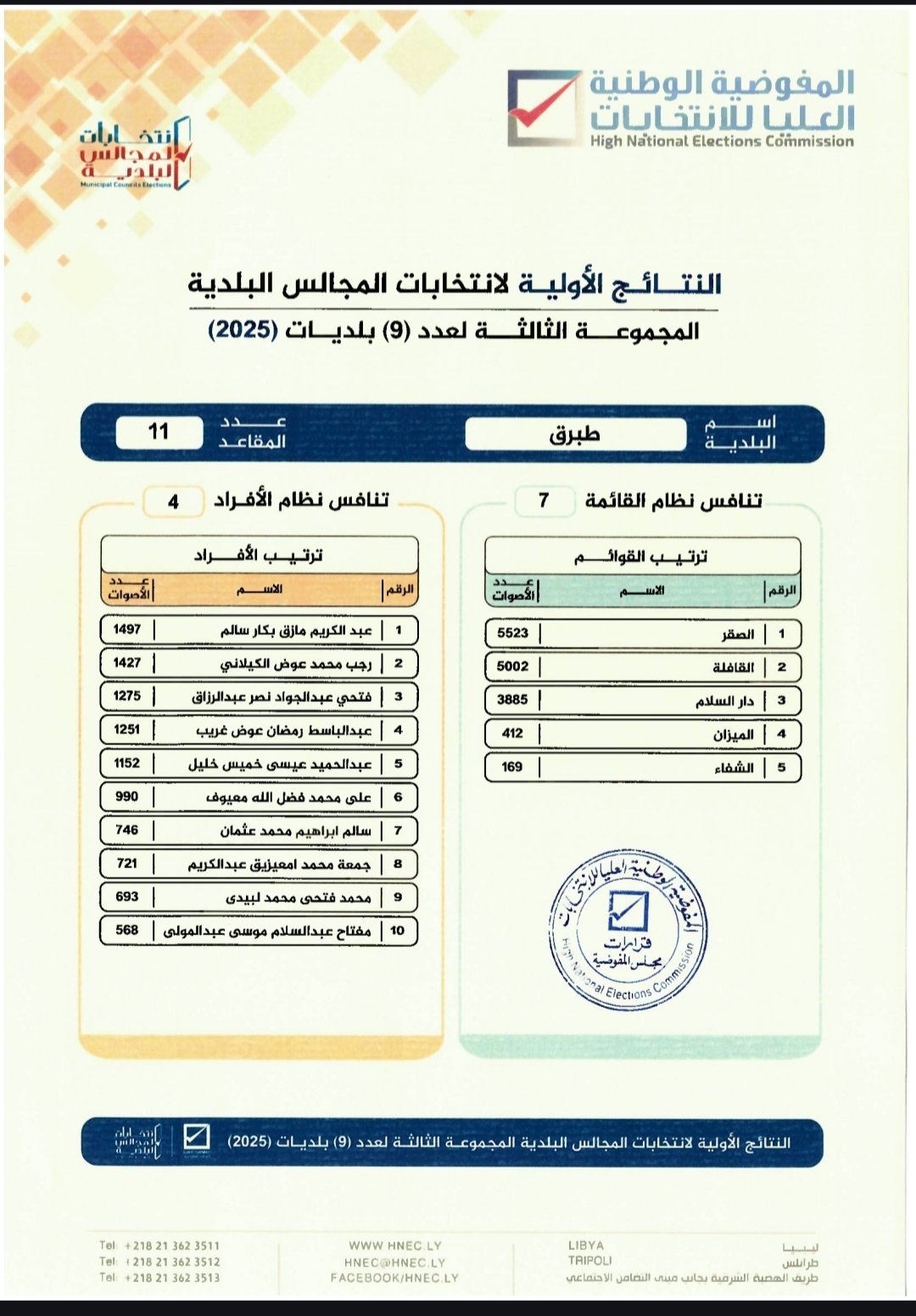 عاجل| المفوضية العليا تعلن النتائج الأولية لانتخابات 9 مجالس بلدية ضمن المجموعة الثالثة. المفوضية تعلن النتائج الأولية لانتخاب المجالس البلدية المجموعة الثالثة 2025 والتي تشمل 9 بلديات.. المفوضية أصدرت اليوم الثلاثاء 23 ديسمبر 2025، القرار رقم 274 لسنة 2025 بشأن اعتماد النتائج الأولية لانتخاب المجالس البلدية المجموعة الثالثة 2025، والتي تضمنت البلديات الآتية: طبرق، قصر الجدي، بنغازي، توكرة، قمينس، سلوق، الأبيار، سرت، سبها.. جاء هذا القرار بعد استكمال مركز العد والإحصاء بالمفوضية إدخال كافة استمارات النتائج الواردة من مكاتب الإدارة الانتخابية وفقاً لأعلى معايير الشفافية والدقة، وبعد فصل المحاكم الجزئية في الأحكام المتعلقة بالطعون الانتخابية. #ليبيا