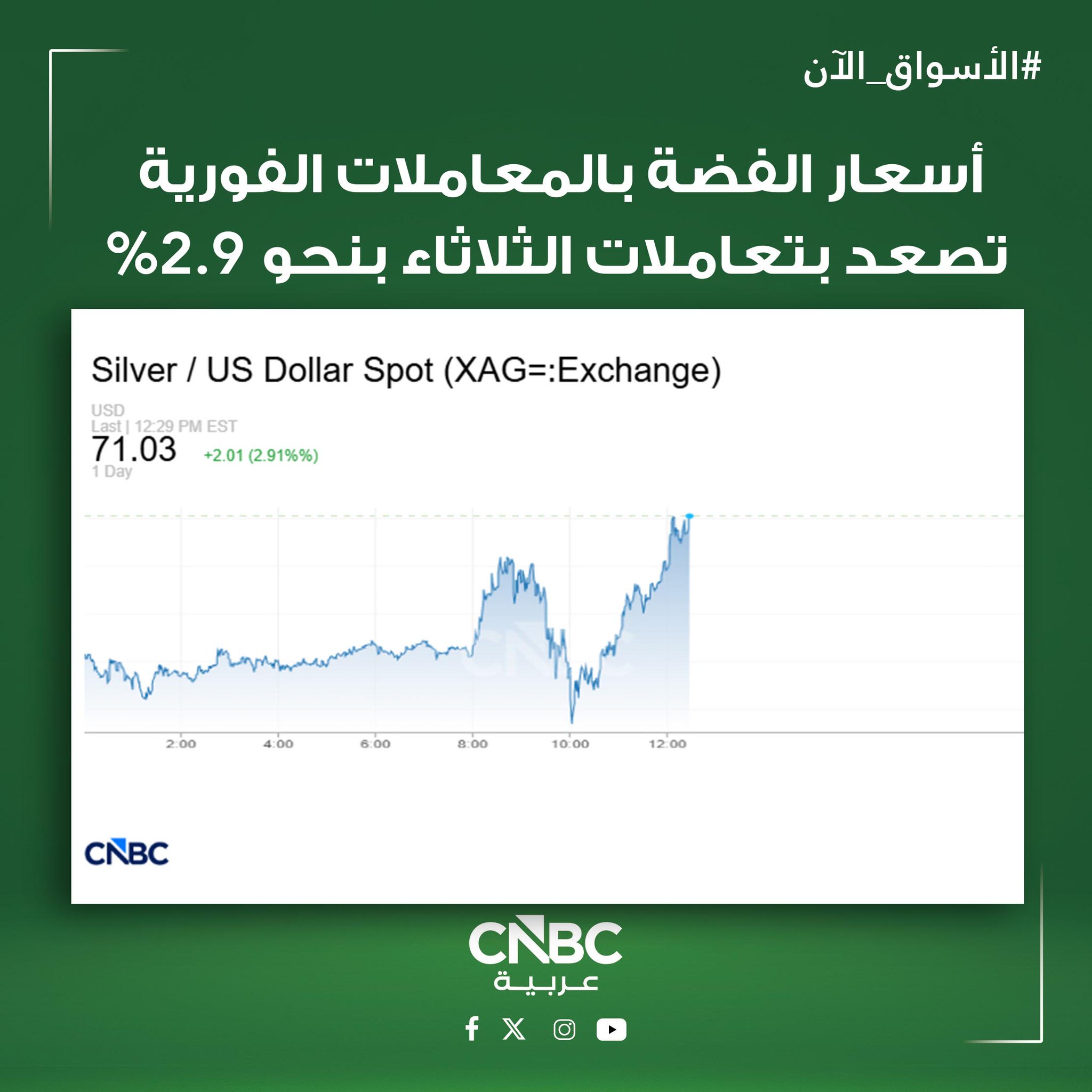 أسعار الفضة في المعاملات الفورية تتجاوز مستوى 71 دولاراً للأونصة للمرة الأولى خلال تعاملات الثلاثاء 23 ديسمبر/ كانون الأول، مسجلة أعلى مستوى لها على الإطلاق. أسعار المعدن النفيس في المعاملات الفورية ترتفع بنحو 2.9% إلى مستوى 71.03 دولار للأونصة. ارتفاع أسعار الفضة يعود إلى نقص المعروض، والطلب الصناعي، وتدفقات الاستثمار، كما تتأثر أسواق المعادن بتوقعات الأسواق بخفض معدلات الفائدة الأميركية في عام 2026. التوقعات بسياسة نقدية متساهلة ترجع إلى التقارير التي تفيد بأن الرئيس الأميركي دونالد ترامب يخطط لتعيين رئيس جديد لمجلس الاحتياطي الفدرالي في أوائل العام المقبل، ليخلف الرئيس الحالي جيروم باول الذي تنتهي ولايته في مايو/ أيار المقبل