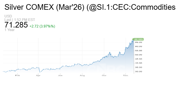 ارتفعت الفضة في المعاملات الفورية بنسبة 2.7% لتسجل 70.90 دولاراً للأونصة، بعد أن بلغت مستوى قياسياً عند 71.06 دولاراً في وقت سابق. وقفزت الأسعار بنسبة 145% منذ بداية العام.