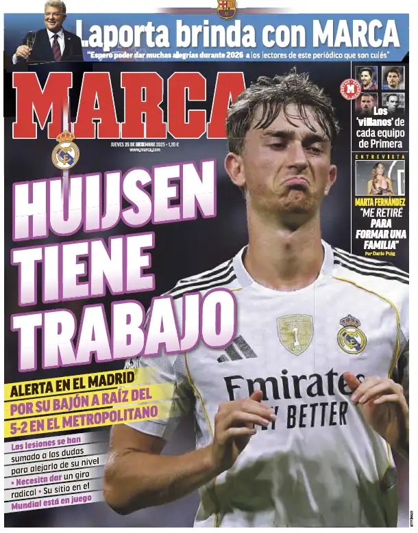 اهتمت الصحيفة بمدافع ريال مدريد الشاب دين هويسن، وكتبت: "دين هويسن يواجه مهمة صعبة"، و"إنذار في مدريد بعد تراجع مستواه عقب الهزيمة 5-2 أمام أتلتيكو مدريد"، إضافة إلى عنوان: "الإصابات المتكررة تزيد الشكوك".