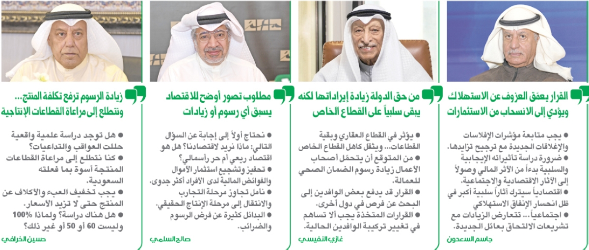 وفي هذا السياق، وعن قرار زيادة رسوم التأمين الصحي على المقيمين في الكويت، وأثره السلبي على الاقتصاد المحلي والتضخم، قال جاسم السعدون: «لابد من البدء بأن من حق الدولة أن تفرض وتعدل مستويات الرسوم والضرائب»، لافتاً إلى أن ذلك حق سيادي، لكنه يجب أن يكون مشروطاً بحصافة وشمولية دراسة تأثيراتها الإيجابية والسلبية، بدءاً بالأثر المالي، ومروراً بآثارها الاقتصادية والاجتماعية.