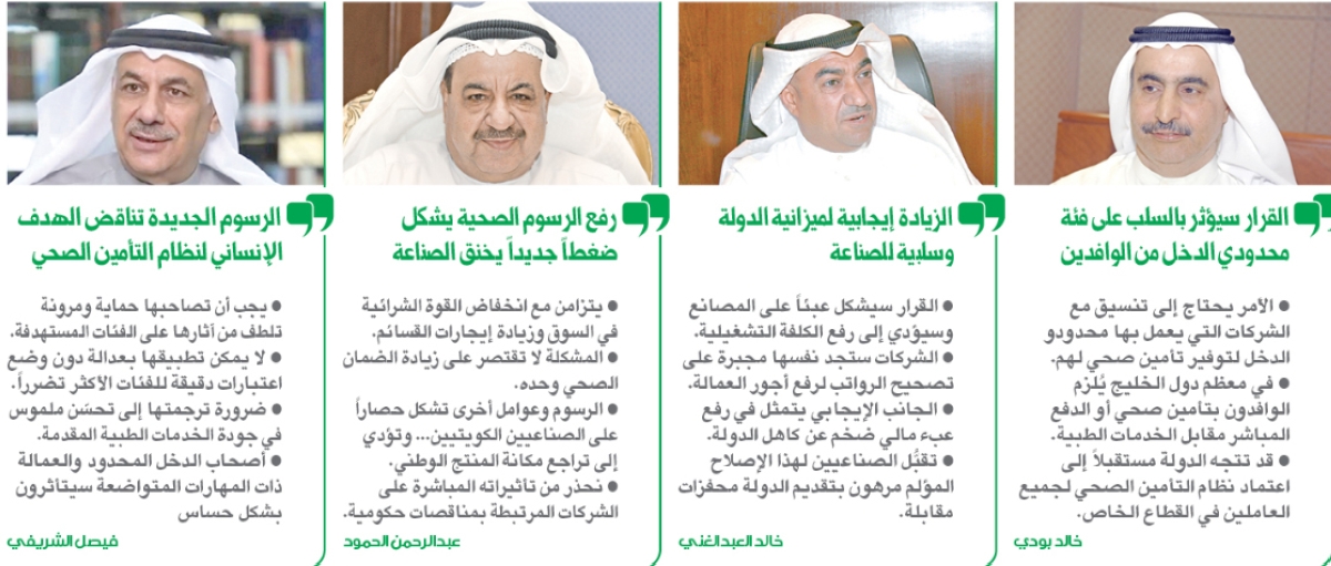 من جهته، قال رئيس اتحاد الصناعات الكويتية، حسين الخرافي، بشأن ملف زيادة الرسوم الصحية الأخيرة: كنّا نتطلع إلى أن تكون هناك مراعاة للقطاعات المنتجة، ومنها القطاع الصناعي، أسوة بالخطوة التي اتخذتها المملكة العربية السعودية أخيراً بإلغاء جميع الرسوم على القطاع الصناعي في هذا الخصوص.