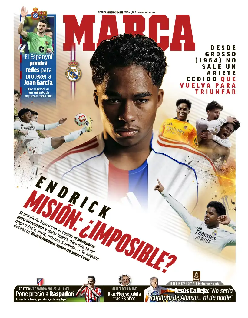 عنونت الصحيفة الإسبانية الشهيرة في غلافها، قائلة: "إندريك.. المهمة المستحيلة"، وتحدثت عن محاولة اللاعب البرازيلي للعودة إلى ريال مدريد من خلال التألق في رحلة إعارته إلى ليون.