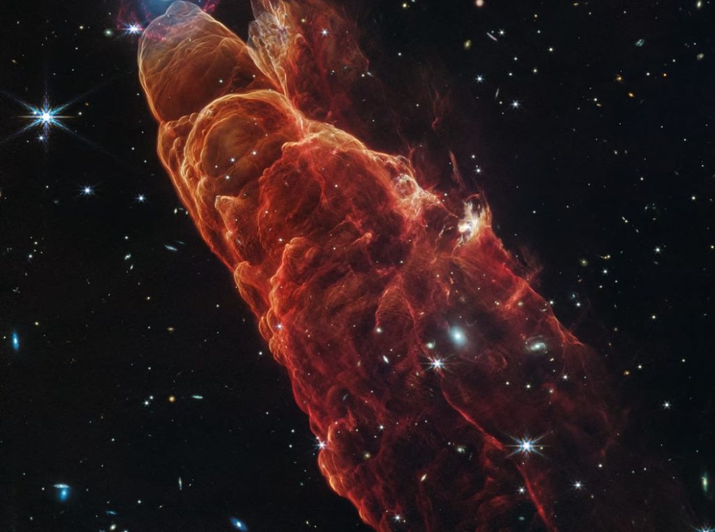 التقط تلسكوب جيمس ويب صورة مذهلة لتدفق غازي من نجم حديث التكوين، يعرف باسم هيربيغ-هارو (HH 49/50)، والذي أُطلق عليه لقب "الإعصار الكوني". يظهر العمود الضخم من الغاز والغبار وكأنه يغطي مجرة، بينما تبعد المجرة الحقيقية سنوات ضوئية عن المشهد. تُعدّ أجسام هيربيغ-هارو تدفقات ناتجة عن نفاثات صادرة من نجوم قريبة في طور التكوين.