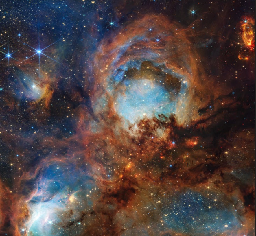 التقط تلسكوب جيمس ويب الفضائي صورة مذهلة لـ سديم مخلب القط، منطقة محلية نشطة لتكوّن النجوم تتألف من الغاز والغبار والنجوم الفتية. تظهر في مركز الصورة، وأيضًا بشكل بيضاوي أعلى اليمين، كتل نارية وسط الغبار البني، حيث لا يزال تكوّن النجوم الضخمة جارياً. جرى رصد الصورة بالتعاون بين ناسا، وكالة الفضاء الأوروبية، وكالة الفضاء الكندية، ومعهد علوم تلسكوب الفضاء.