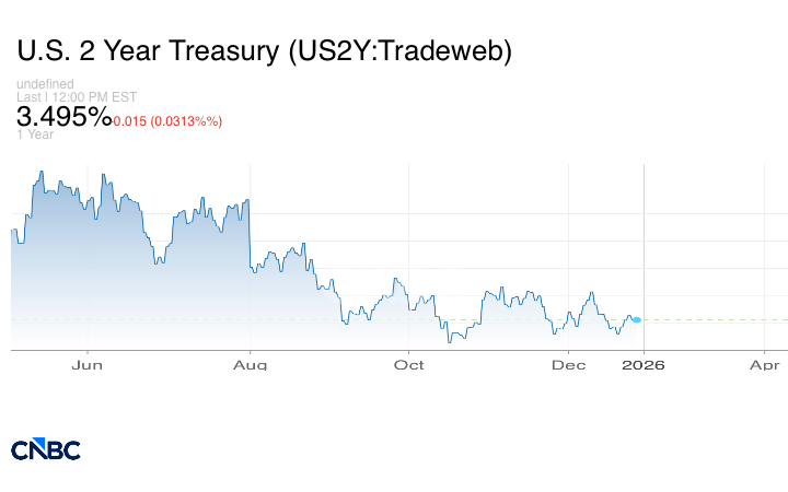 وانخفض عائد سندات الخزانة لأجل سنتين إلى 3.495%.
