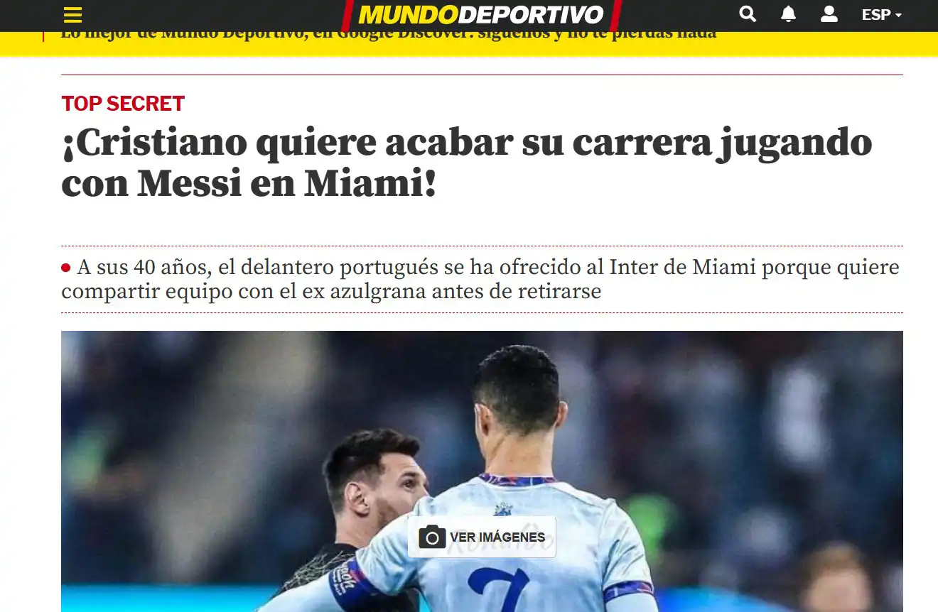 في تقرير مفاجئ، زعمت صحيفة "موندو ديبورتيفو" بأن الأسطورة البرتغالي كريستيانو رونالدو، قائد النصر السعودي، طلب من وكلائه بحث إمكانية انتقاله إلى صفوف إنتر ميامي، من أجل اللعب بجوار غريمه الأزلي، ليونيل ميسي، في المدة المقبلة.