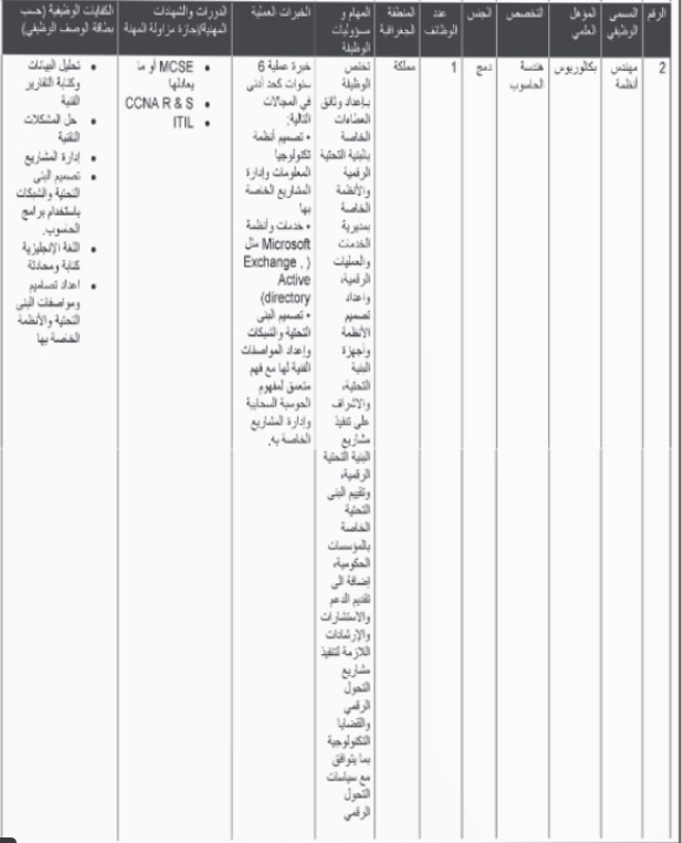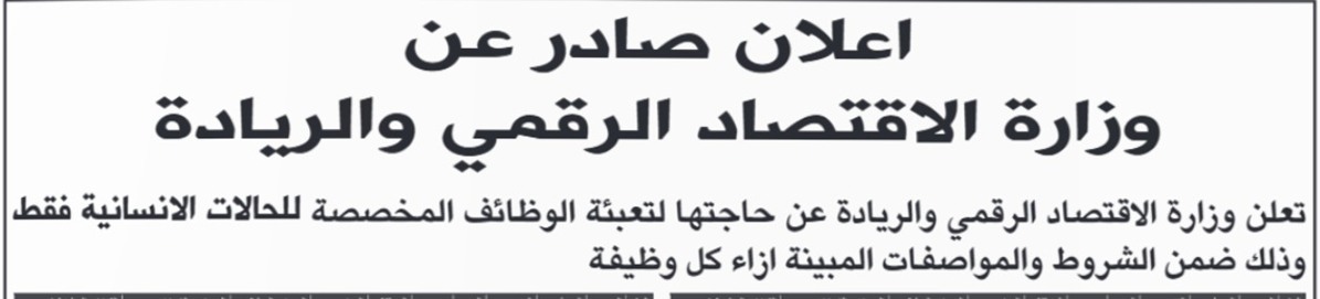الوكيل الإخباري- اعلنت وزارة الاقتصاد الرقمي والريادة، اليوم الاثنين عن حاجتها لتعبئة عدد من الوظائف الشاغرة.