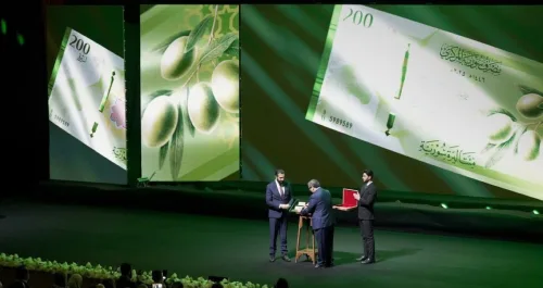 كشف رئيس الجمهورية العربية السورية أحمد الشرع وحاكم مصرف سورية المركزي عبد القادر الحصرية عن العملة السورية الجديدة، خلال الحفل الرسمي الذي أقيم مساء اليوم الاثنين في مدينة المعارض على طريق مطار دمشق. الشرع وخلال جلسة حوارية في الحفل قال: إن مرحلة التحول حساسة ودقيقة، وأهم عامل فيها هو عدم حدوث حالة فزع بين الناس وعدم التسارع لرمي العملة القديمة واستبدالها بالجديدة.