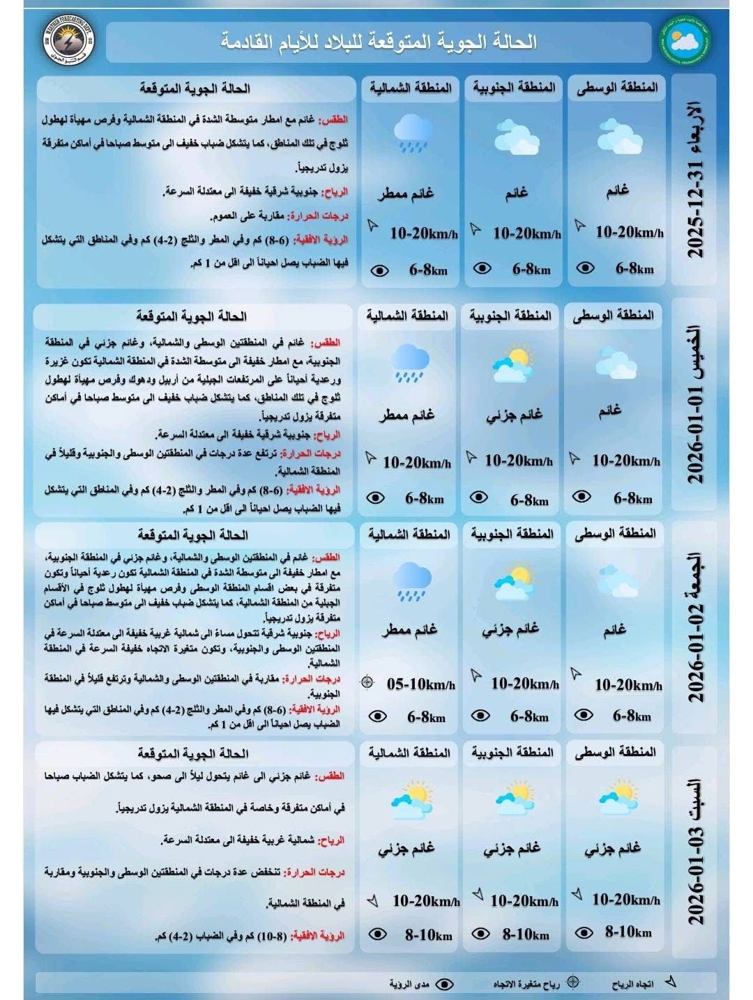 توقعت السومرية نيوز توقعت هيئة الانواء الجوية اليوم الثلاثاء، استمرار تساقط الامطار والثلوج حتى السبت المقبل، فيما اشارت الى ان محافظة ستسجل حرارة تصل الى (-5) غدا الأربعاء. وقالت الهيئة في بيان ورد لـ السومرية نيوز، ان "طقس يوم غد الأربعاء سيكون غائم مع امطار متوسطو الشدة في المنطقة الشمالية وفرص مهيئة لتساقط ثلوج في تلك المناطق كما يتشكل ضباب خفيف الى متوسط صباحا في أماكن متفرقة ودرجات الحرارة مقاربة لليوم السابق"، مبينا ان "طقس الخميس المقبل سيكون غائما في المنطقتين الوسطى والشمالية وغائم جزئي في المنطقة الجنوبية مع امطار خفيفة الى متوسطة الشدة في المنطقة الشمالية تكون غزيرة ورعدية أحيانا مع فرص هطول ثلوج في المرتفعات الجبلية في أربيل ودهوك كما يتشكل ضباب خفيف الى متوسط صباحا في أماكن متفرقة ودرجات الحرارة ترتفع عدة درجات في المنطقتين الوسطى والجنوبية وقليلا في المنطقة الشمالية".