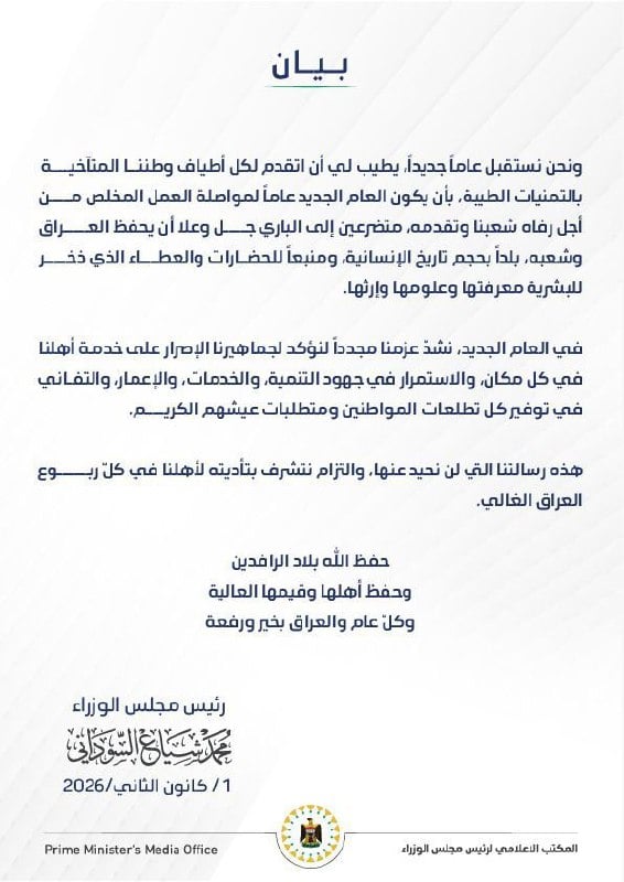السوداني مهنئا بالعام الجديد: نشد عزمنا مجددا