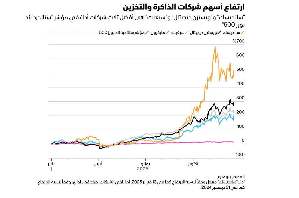 تتصدر شركة سانديسك Sandisk ، المتخصصة في الذاكرة والتخزين، القائمة، تليها شركة ويسترن ديجيتال (Western Digital)، التي تصنع محركات الأقراص الصلبة، ثم منافستها سيغيت تيكنولوجي هولدينغ (Seagate Technology Holdings) وتحتل ميكرون تيكنولوجي (Micron Technology)، أكبر شركة أميركية مصنعة لرقائق الذاكرة، المرتبة الخامسة.