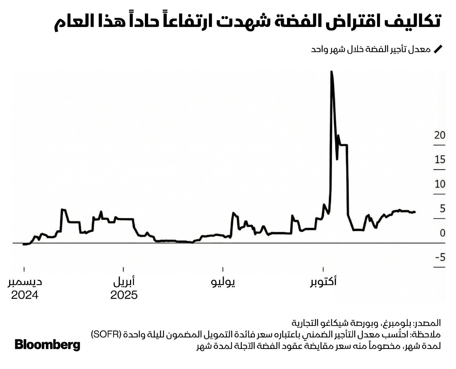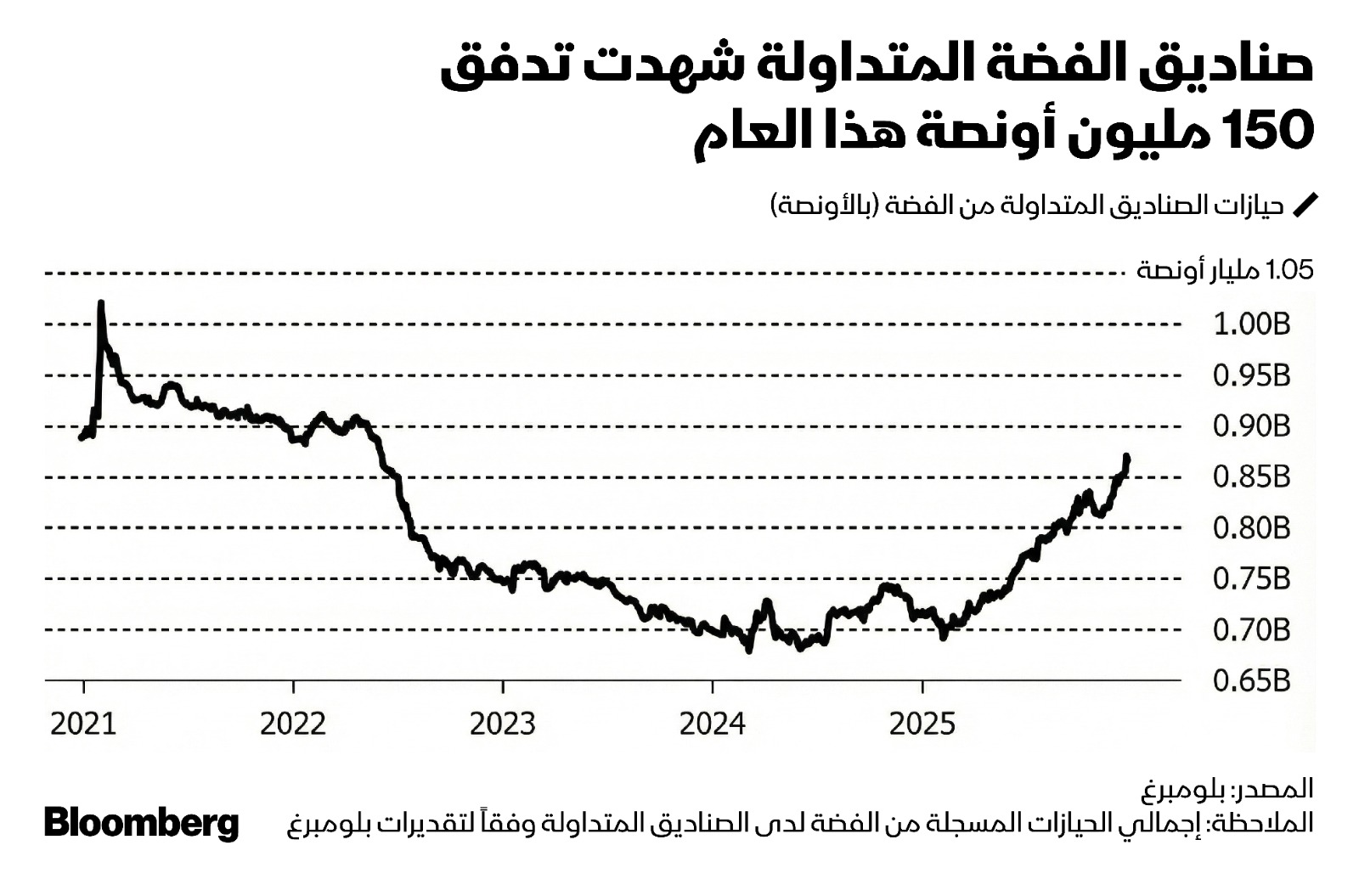 تدفقات الصناديق المتداولة للفضة ارتفعت حيازات الصناديق المتداولة المدعومة بالفضة الفعلية هذا العام بأكثر من 150 مليون أونصة. ورغم أن إجمالي الكميات لا يزال دون الذروة المسجلة خلال موجة استثمارات الأفراد المدفوعة بتوصيات المستخدمين على منصة ريديت في 2021، فإن هذه التدفقات لعبت دوراً حاسماً في تقليص المعروض المتاح داخل سوق تعاني أصلاً من شح الإمدادات. وتشير حسابات "بلومبرغ" إلى أن الحيازات ارتفعت في جميع أشهر العام باستثناء شهر واحد.