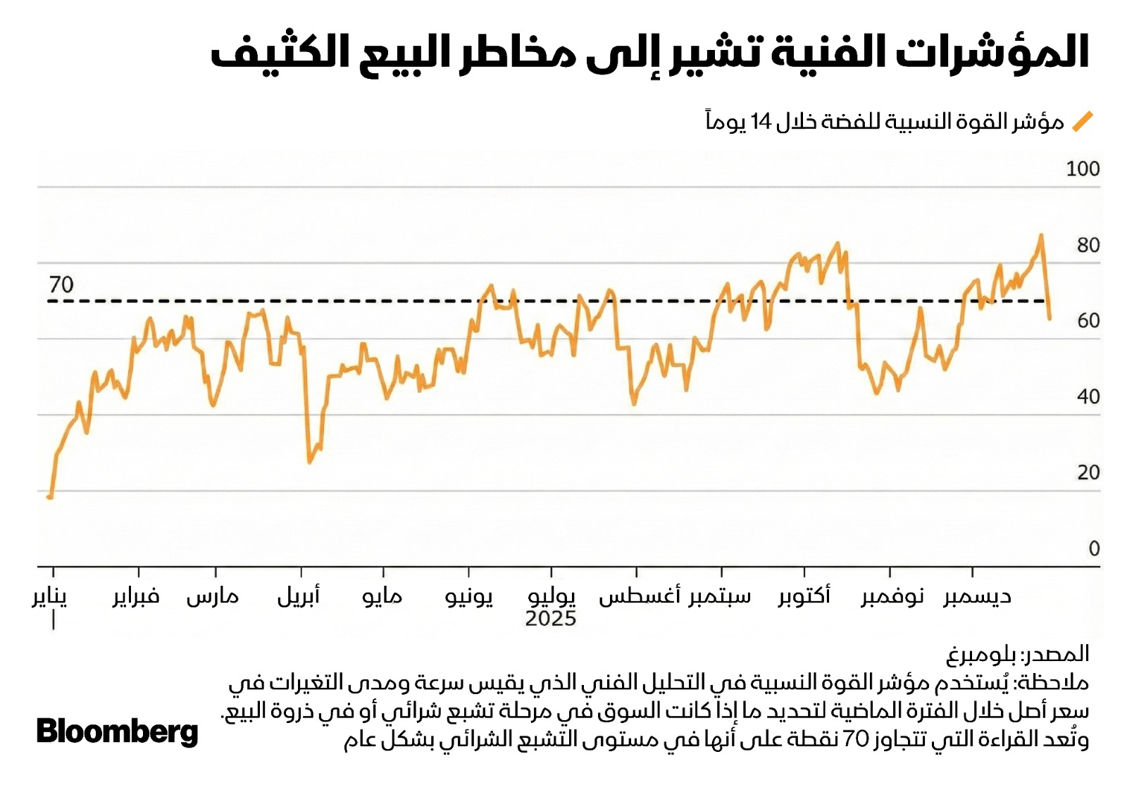 المؤشرات الفنية ومتطلبات الهامش قفزت أسعار الفضة بأكثر من 25% خلال ديسمبر وحده، لتتجه نحو أكبر مكسب شهري منذ 2020. غير أن سرعة الصعود دفعت بعض المؤشرات الفنية إلى التحذير من أن الأسعار ارتفعت بسرعة مفرطة. فقد ظل مؤشر القوة النسبية -الذي يقيس زخم الشراء والبيع- فوق مستوى 70 طوال معظم.....