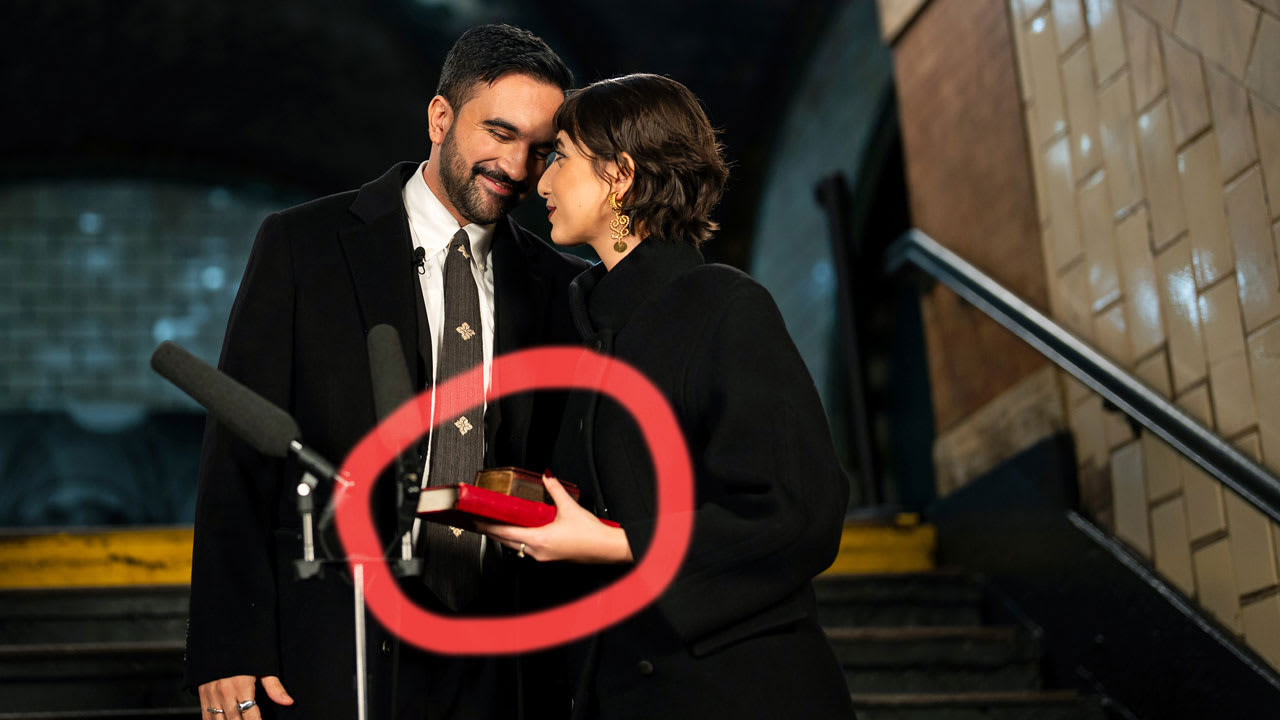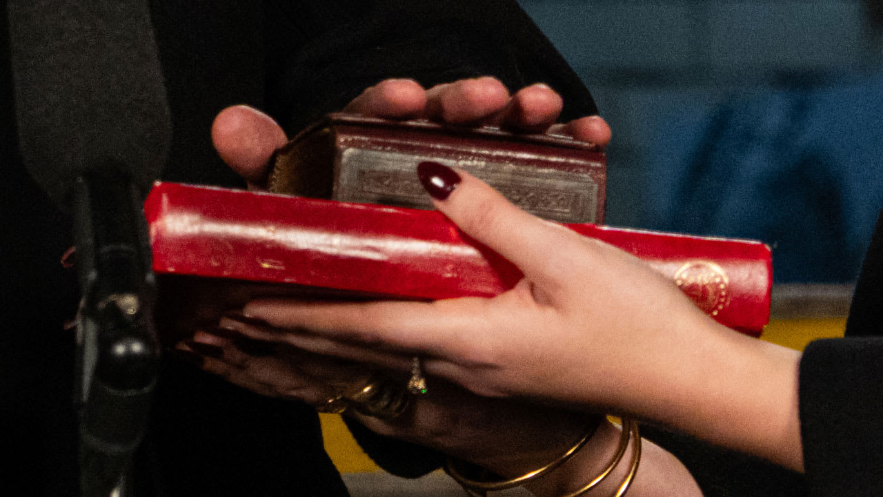 نسختا قرآن تحت يد ممداني أثناء أدائه القسم كأول عمدة مسلم لمدينة نيويورك في مراسم خاصة أقيمت بمحطة مترو تاريخية