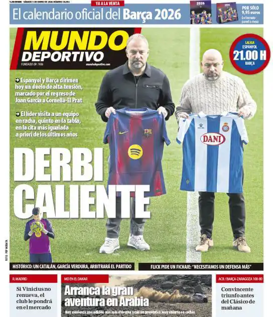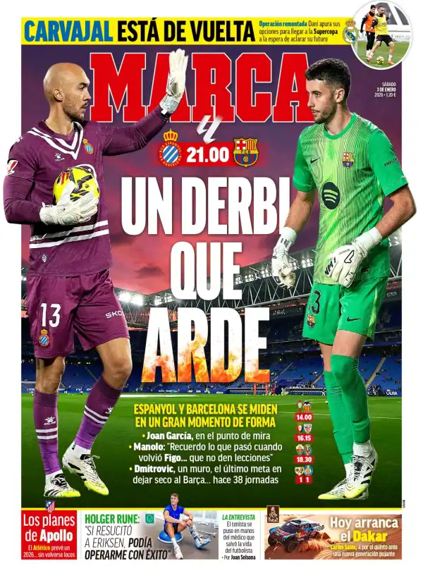 ركزت الصحيفة على "ديربي كتالونيا" بين إسبانيول وبرشلونة في الدوري الإسباني، وكتبت: "برشلونة ضد إسبانيول.. ديربي مشتعل"، "إسبانيول وبرشلونة يتواجهان في أفضل فترتهما".