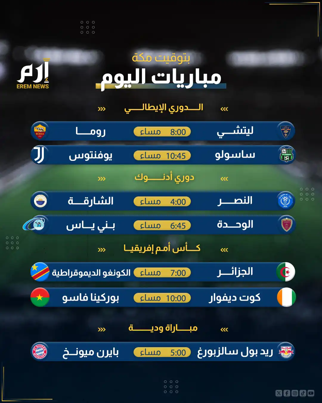 وتشهد منافسات الدوري الإيطالي مواجهة بين ليتشي وروما كما يلعب ساسولو مع يوفنتوس بينما يخوض بايرن ميونخ الألماني مواجهة ودية ضد رد بول سالزبورغ النمساوي.