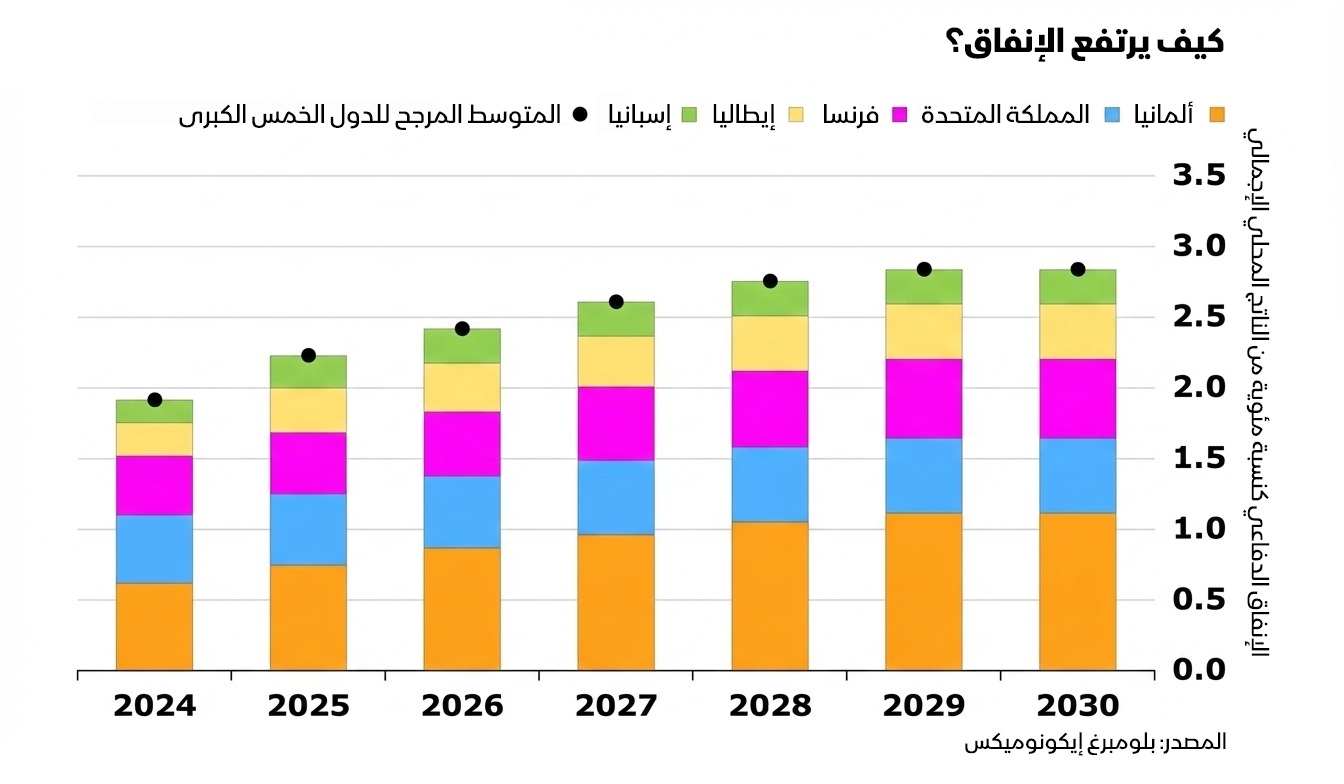 نتوقع، في المتوسط، أن يرتفع الإنفاق الدفاعي في أكبر خمسة اقتصادات أوروبية، أي ألمانيا وفرنسا والمملكة المتحدة وإيطاليا وإسبانيا، إلى 2.8% من الناتج المحلي الإجمالي بحلول عام 2030، مقارنة مع 1.9% في عام 2024. وتختلف الضرورات العسكرية، والمساحة المالية المتاحة، والأولويات الوطنية بين العواصم الأوروبية الكبرى، ما يعني أن الزيادة لن تكون متساوية.