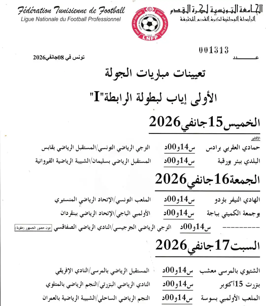 أعلنت الرابطة التونسية لكرة القدم المحترفة اليوم الخميس رسميا عن مواعيد استئناف منافسات دوري المحترفين بعد أيام قليلة على انتهاء مغامرة منتخب تونس في كأس أمم إفريقيا 2025، التي تتواصل في المغرب حتى الثامن عشر من الشهر الجاري.