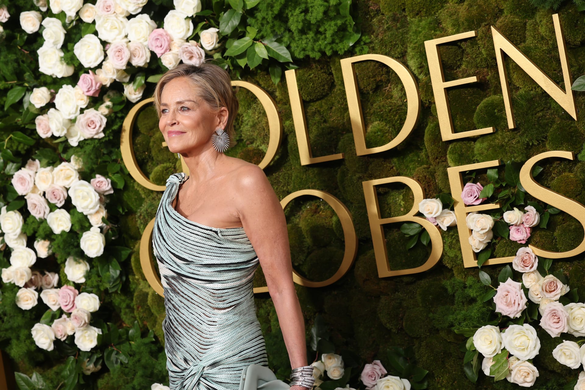 كما تألّقت النجمة الأمريكية شارون ستون بفستان أزرق فاتح بقصّة الكتف الواحد، انسدلت تنورته بطبقات مخملية أنيقة.