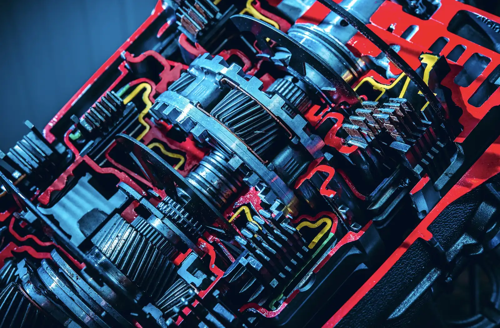 تظهر الصورة الأجزاء والقطع الداخلية لناقل حركة سيارة حديثة