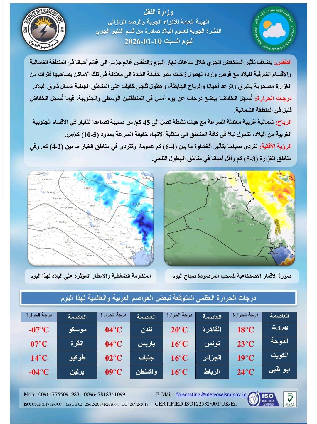 وأشار إلى، أن "يوم الثلاثاء سيكون الطقس غائماً في المنطقة الوسطى وغائماً جزئياً في المنطقة الجنوبية وغائماً مع تساقط أمطار متوسطة الشدة في المنطقة الشمالية وتساقط الثلوج فوق المرتفعات الجبلية، والرياح جنوبية شرقية معتدلة السرعة (20-30) كم/س، تنشط خلال النهار إلى (50) كم/س ابتداءً من المنطقة الغربية مسببة حدوث عواصف غبارية تشمل معظم مناطق البلاد عدا الأجزاء الشمالية، ودرجات الحرارة مقاربة في المنطقتين الوسطى والشمالية وترتفع قليلاً في المنطقة الجنوبية، والرؤية الأفقية (6-8) كم وفي الغبار (2-4) كم وفي العواصف الغبارية أقل من 1000 متر".