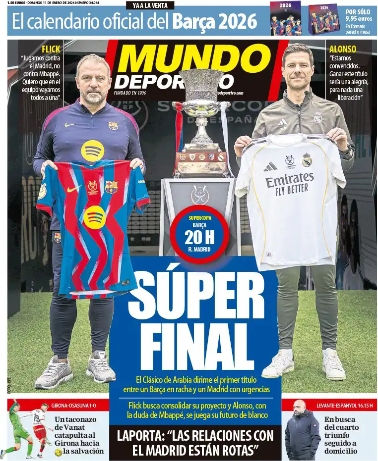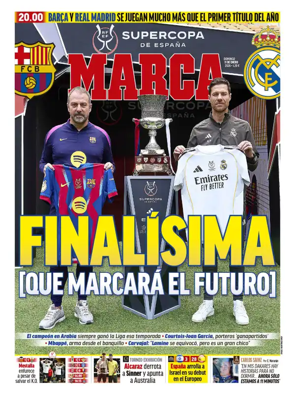 ركزت الصحيفة على نهائي كأس السوبر الإسباني بين ريال مدريد وبرشلونة في جدة بالسعودية، وكتبت: "فيناليسما سيترك أثرًا في كرة القدم"، و"ريال مدريد وبرشلونة يلعبان من أجل أكثر من مجرد لقب".