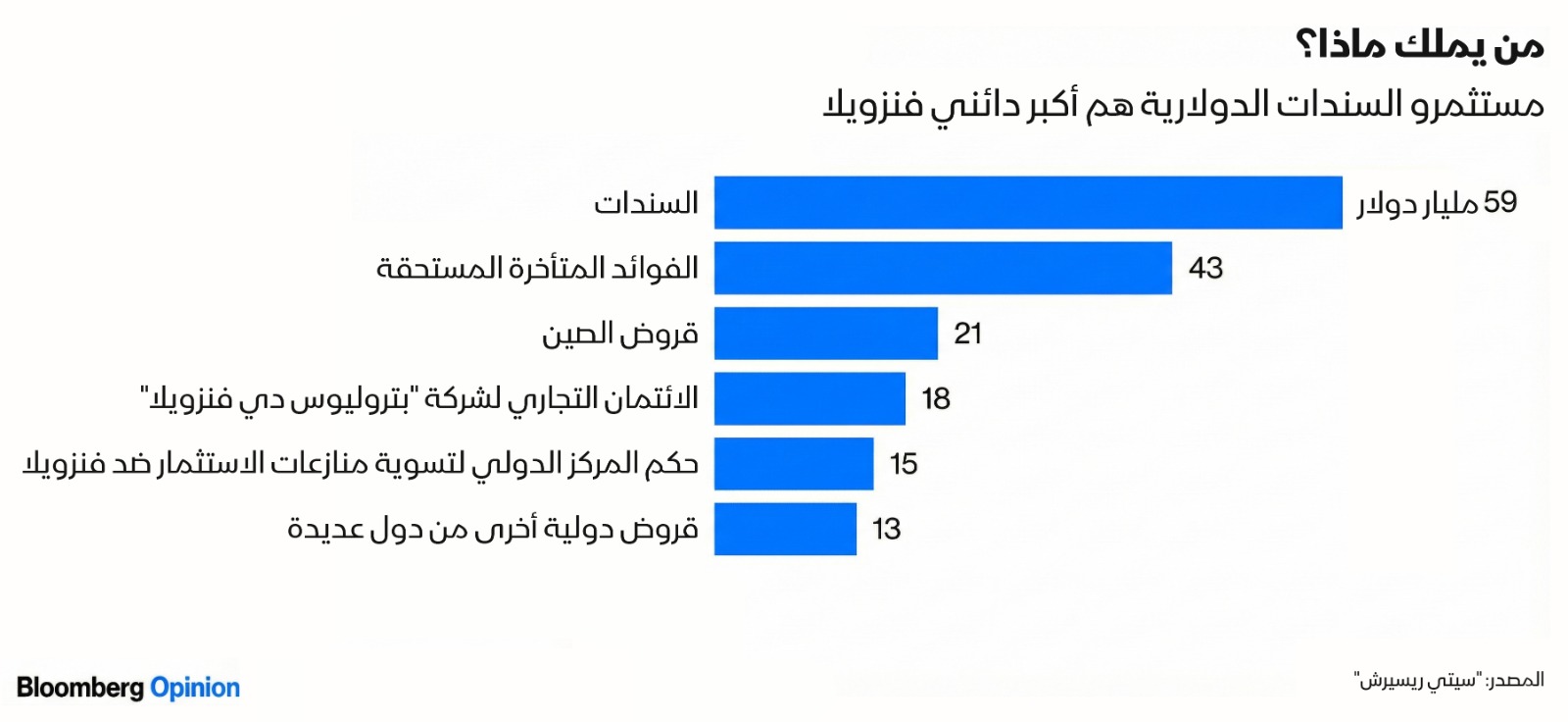 تشير بيانات "سيتي ريسيرش" (Citi Research) إلى أن مستثمري السندات الدولارية هم أكبر دائني فنزويلا. إذ تدين الحكومة وشركة النفط المملوكة للدولة "بتروليوس دي فنزويلا" بنحو 169 مليار دولار من الديون الخارجية، تشمل 59 مليار دولار من السندات غير المضمونة القائمة، و43 مليار دولار من فوائد متأخرة عن السداد. ويضع ذلك نسبة الدين إلى الناتج المحلي الإجمالي عند 173%، أي نحو ضعفي المتوسط البالغ 86% للدول التي خضعت لعمليات إعادة هيكلة ديون جوهرية. وبناء على ذلك، إذا اتبعت فنزويلا مساراً مماثلاً، فسيكون من شبه الحتمي أن يقبل الدائنون الدوليون مجتمعين بخفض اسمي بنحو 50%.
