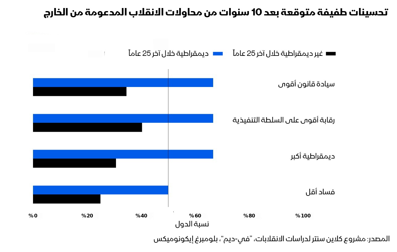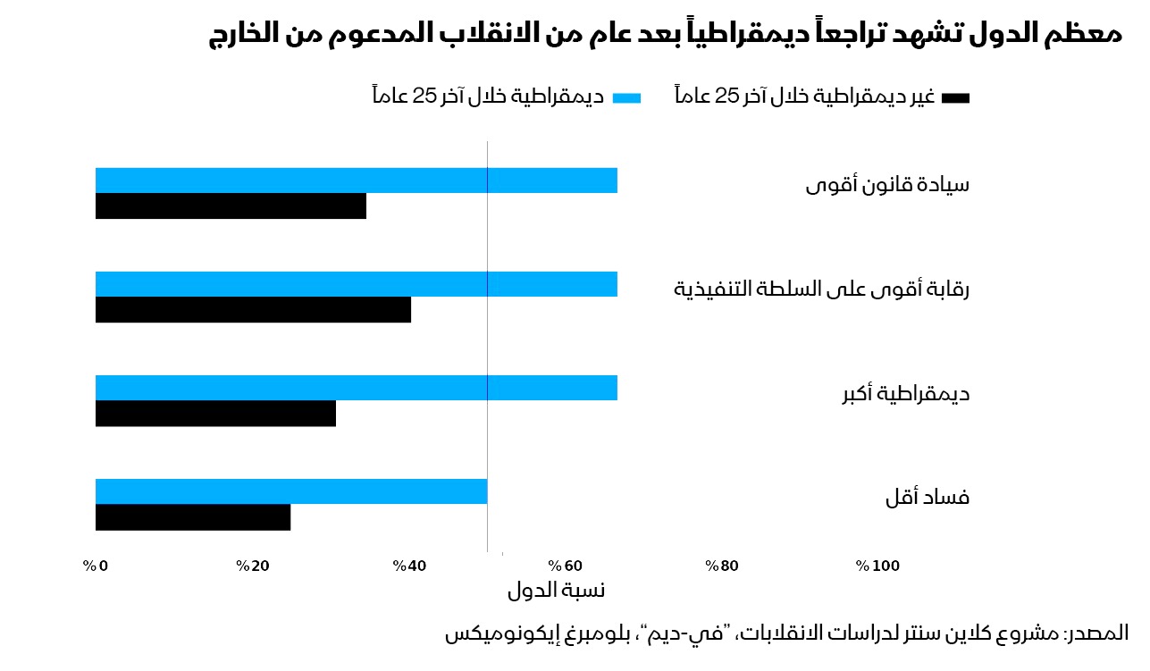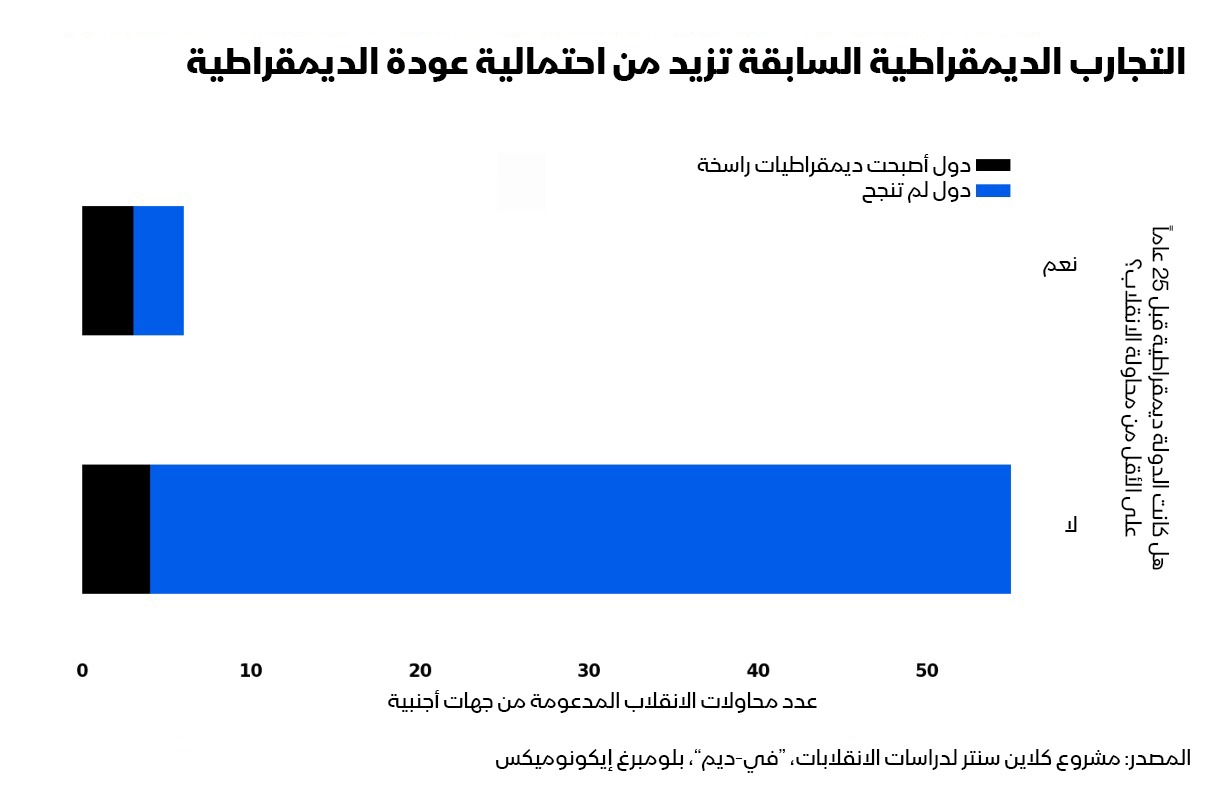 التاريخ لا يدفع لكثير من التفاؤل وفقاً لتحليلنا لقاعدة بيانات مركز كلاين الذي يدرس الانقلابات، من بين 61 محاولة انقلاب مدعومة من الخارج منذ عام 1945، لم تفض سوى سبع منها إلى ديمقراطيات استمرت لأكثر من عشر سنوات- أي ما نعتبره "ديمقراطيات راسخة". بالنظر فقط إلى الانقلابات التي يُزعم أنها مدعومة من الولايات المتحدة أو متورطة فيها (مع أن واشنطن تنفي في معظم الحالات أي دور لها)، لم تتحول سوى اثنتين من أصل 24 إلى ديمقراطيات راسخة.