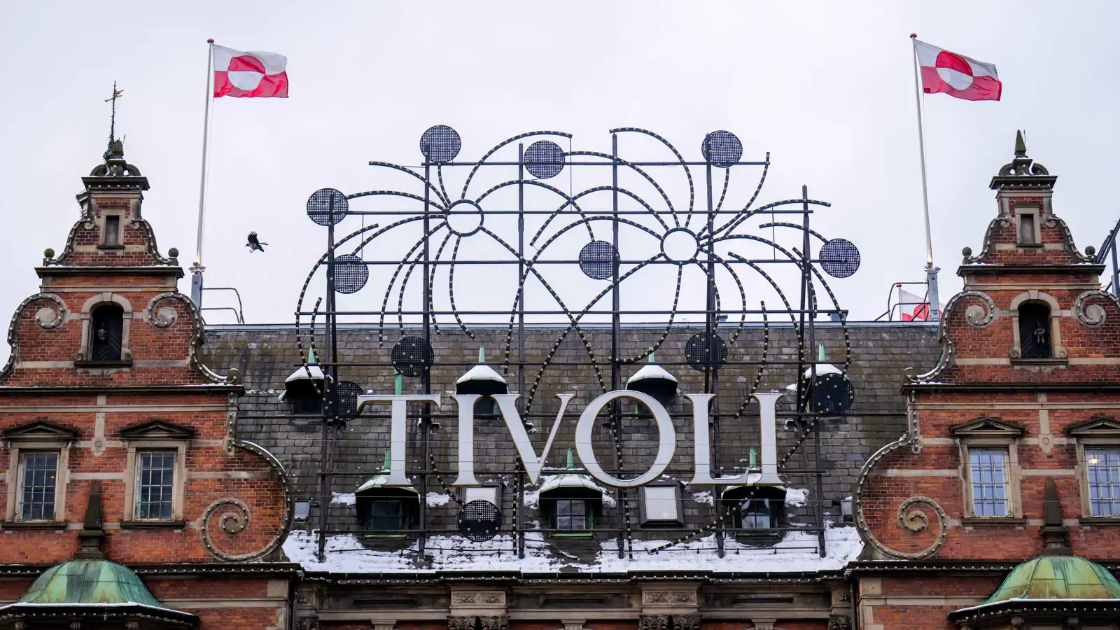 علم غرينلاند يرفرف على قلعة تيفولي، كوبنهاجن، الدنمارك، في يوم 8 يناير 2026