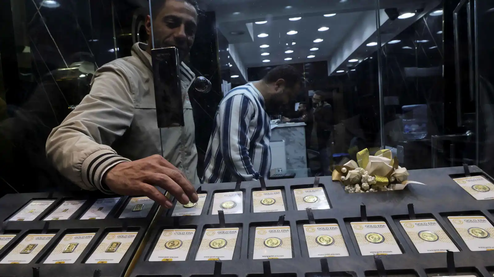 بائع ذهب يقوم بفرز سبائك وعملات ذهبية داخل متجر في منطقة سوق الذهب، القاهرة - 12 يناير 2024