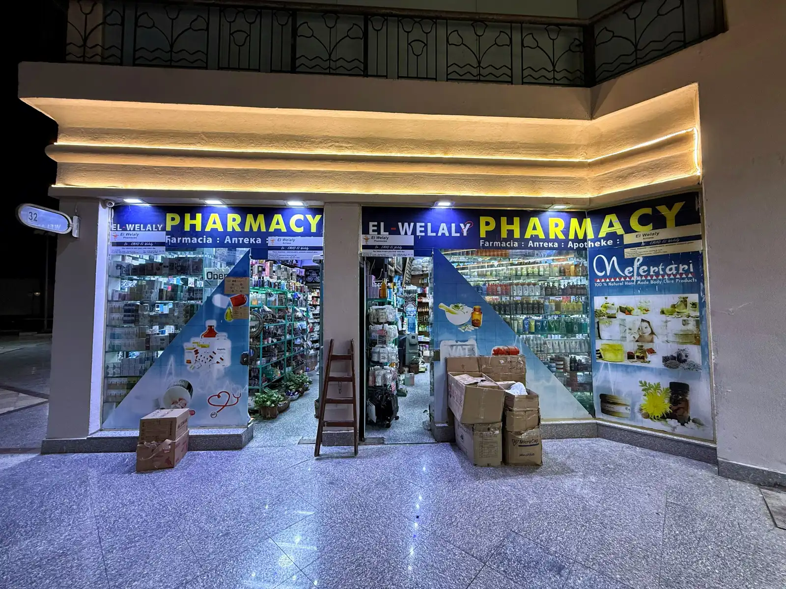الواجهة الخارجية لإحدى الصيدليات ليلاً، شرم الشيخ، مصر، 29 نوفمبر 2025.