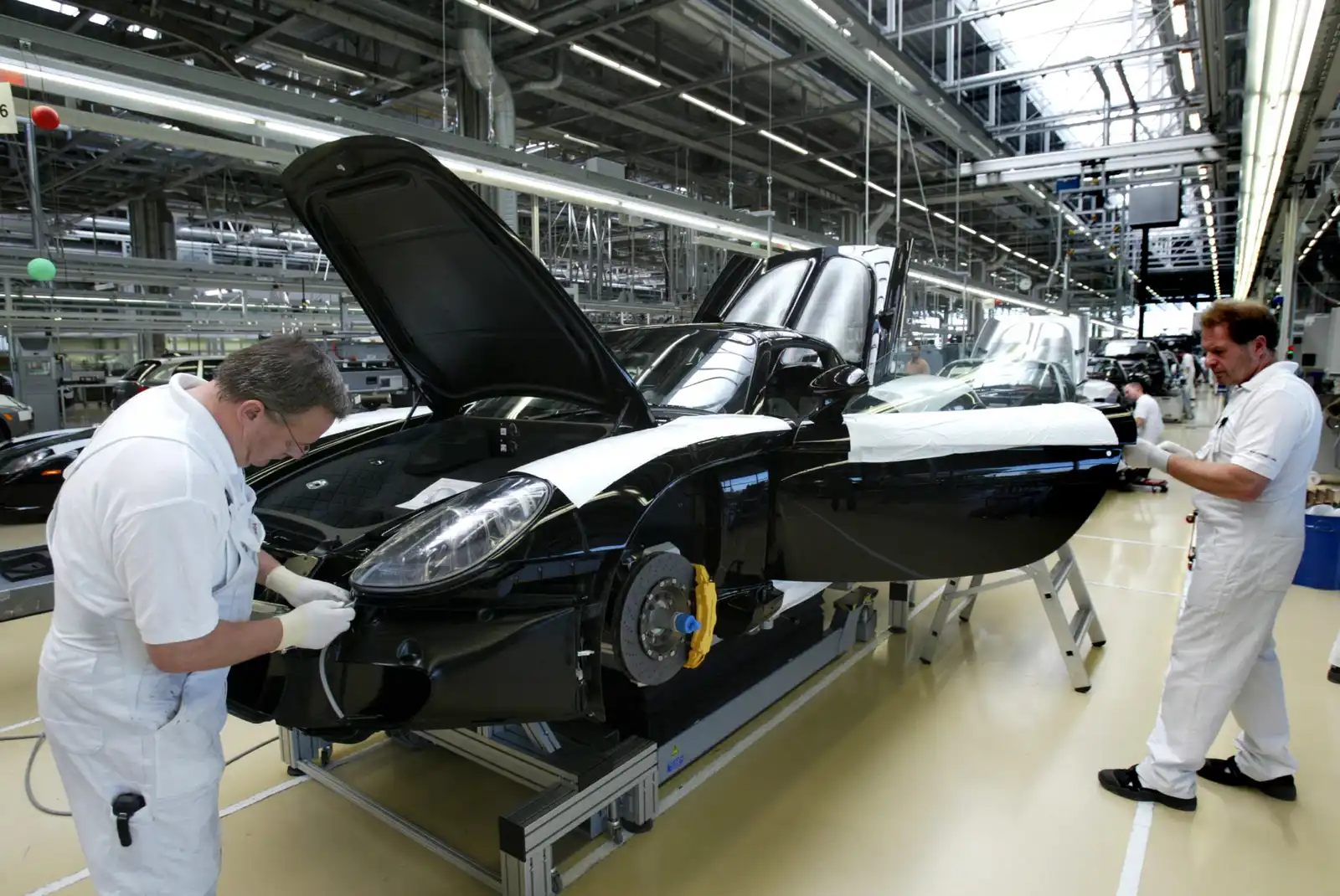 يقوم عمال بورشه بتجميع سيارة «كاريرا جي تي» في مصنع الشركة الألمانية 7 سبتمبر 2005، في مدينة لايبزيغ، ألمانيا