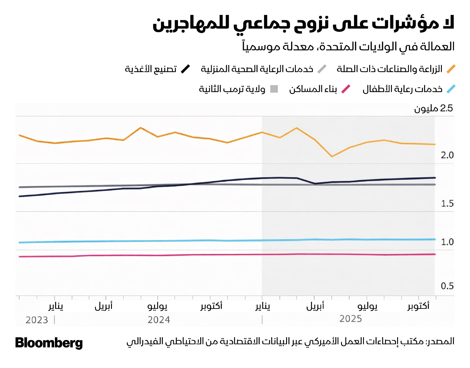 تُظهر هذه الخطوط المستقيمة أن مستويات التوظيف في القطاعات الأميركية الأكثر اعتماداً على العمالة غير الشرعية، مثل الرعاية الصحية ورعاية الأطفال والزراعة وتصنيع الأغذية والبناء السكني، ظلت ثابتةً تقريباً منذ تولي ترمب منصبه مجدداً. وهذا يعني ضمنياً أن أعداداً كبيرة من العمال غير الشرعيين لم يغادروا بعد.