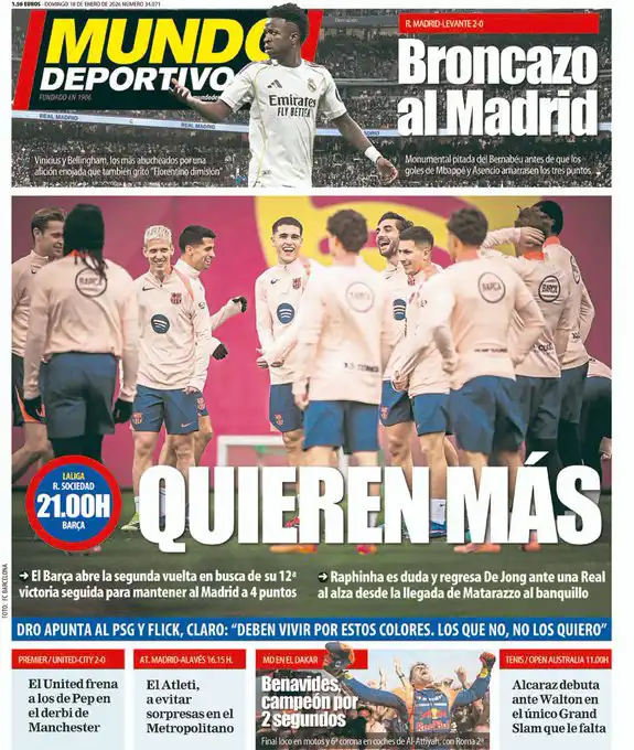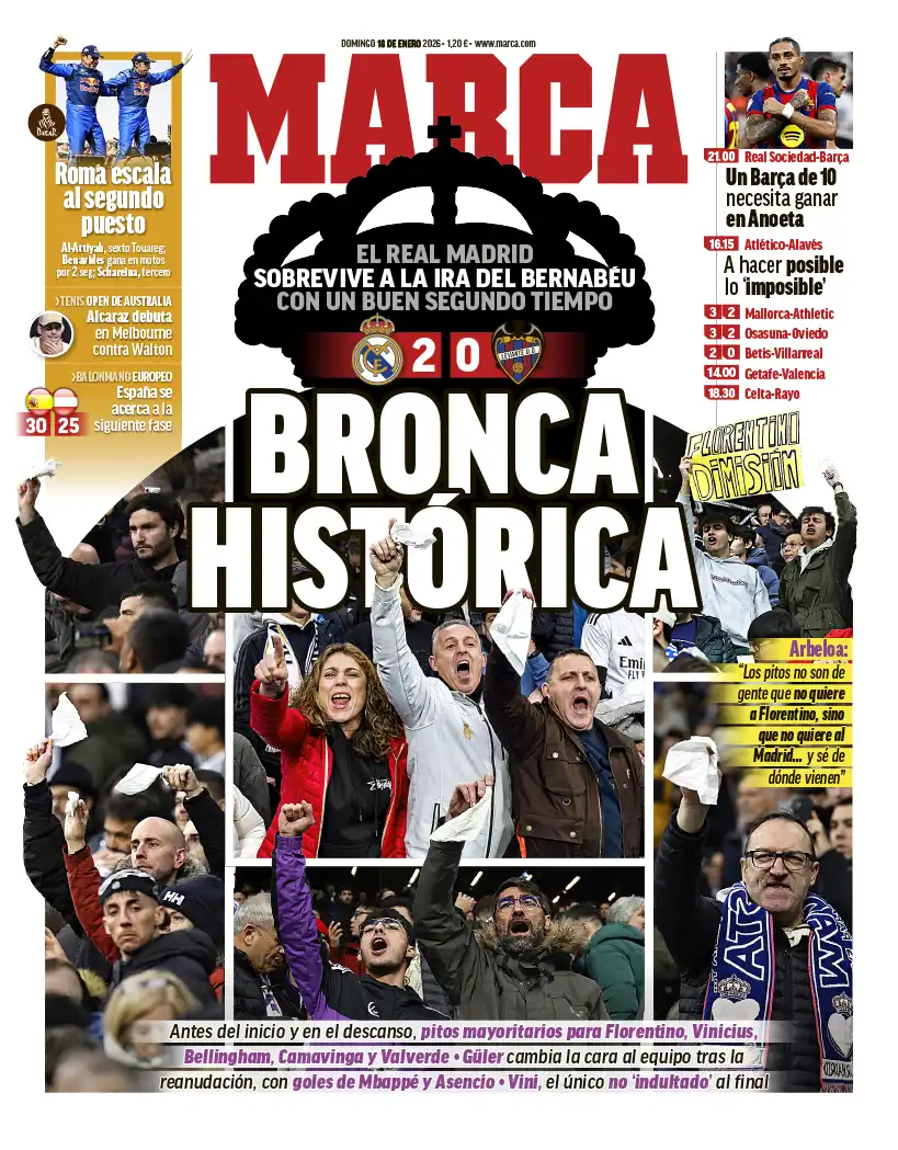ركّزت الصحيفة الإسبانية على فوز ريال مدريد على ليفانتي (2-0)، وما رافقه من صافرات استهجان ضد اللاعبين والإدارة، وكتبت: "خلاف تاريخي" و"اختبار ريال مدريد في سانتياغو برنابيو".
