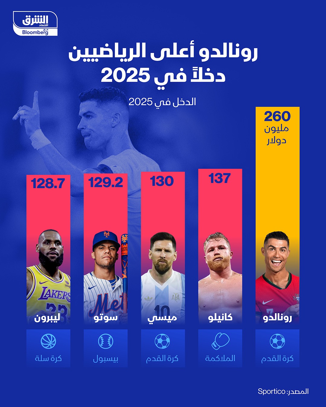 القائمة التي صدرت عن موقع "سبورتيكو" الأميركي، المختص بالتقارير والأخبار الرياضية المالية، ضمت كذلك المصري محمد صلاح جناح "ليفربول" الإنجليزي، والملاكم المكسيكي كانيلو ألفاريز الذي يمتلك عقداً مع موسم الرياض، ولاعب الغولف الإسباني جون رام الذي ينتمي لدوري "ليف غولف" المملوك لصندوق الاستثمارات العامة السعودي، فيما جاء الأرجنتيني ليونيل ميسي ثالثاً.