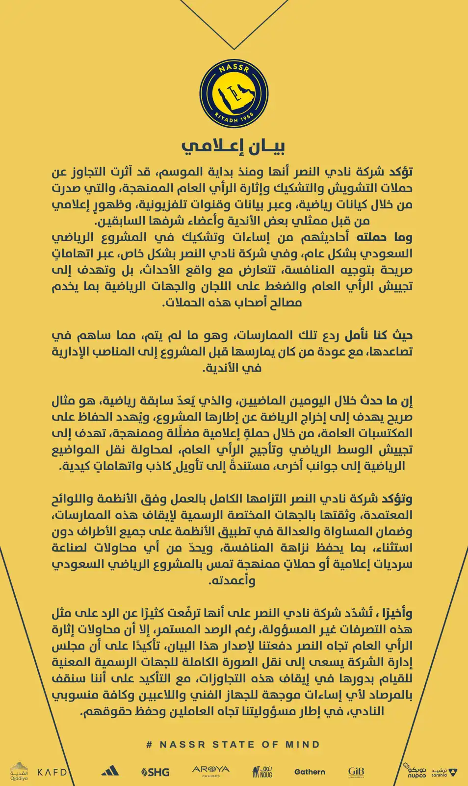 أصدر نادي النصر السعودي بياناً نارياً مساء الأحد رداً على ما وصفته بحملات التشويش والتشكيك وإثارة الرأي العام الممنهجة.