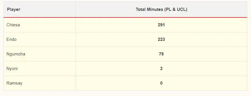 ورغم ذلك، لم يشارك كييزا، وإندو، ونغوموها، ونيوني، ورامزي معًا كأساسيين إلا في مباراة واحدة بالدوري الإنجليزي الممتاز ودوري أبطال أوروبا، عندما حصل الإيطالي كييزا على فرصة اللعب أساسيا أمام وولفرهامبتون في ظل غياب ألكسندر إيزاك، ومحمد صلاح، وكودي جاكبو، ودومينيك سوبوسلاي.