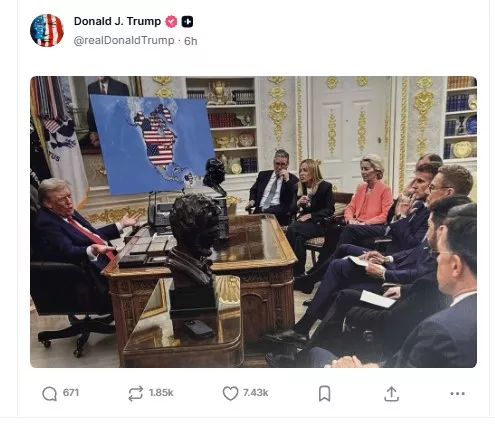 شارك الرئيس الأمريكي دونالد ترامب صورة، يبدو أنها معدلة بالذكاء الاصطناعي، تُظهره جالسًا بجانب خريطة للولايات المتحدة تشمل جرينلاند وكندا وفنزويلا أثناء حديثه مع قادة أوروبيين.
