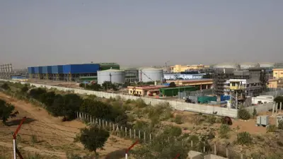 عمال بمحيط مصفاة لتكرير النفط في ولاية البنجاب الهندية يوم 27 أبريل 2012.